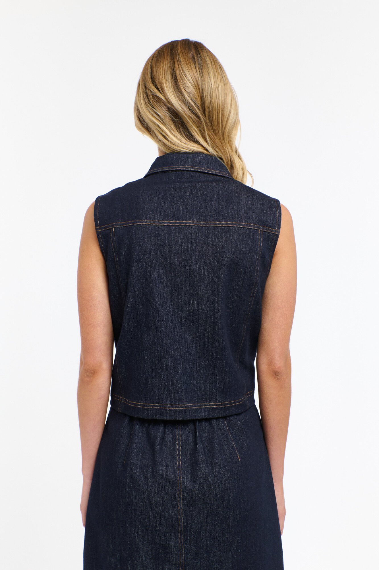 A modern twist on a classic denim piece, the Pocket Rocket Vest brings structure and style in one. With button-through front, feature stitching, and oversized pockets, it’s perfect for layering over tees or pairing with the matching skirt for a sleek, coordinated look.