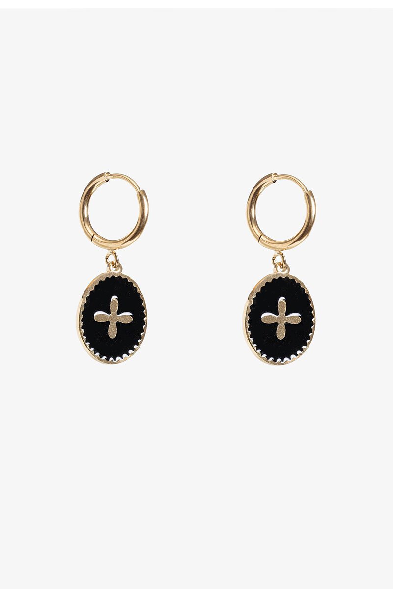 Gold hoop earrings with black enamel oval drops and a subtle cross detail — timeless, elegant, and easy to style.