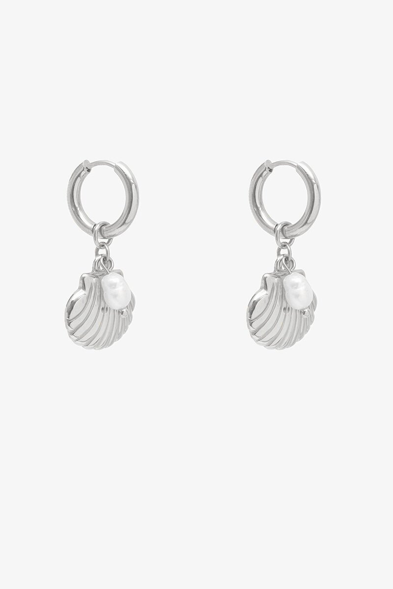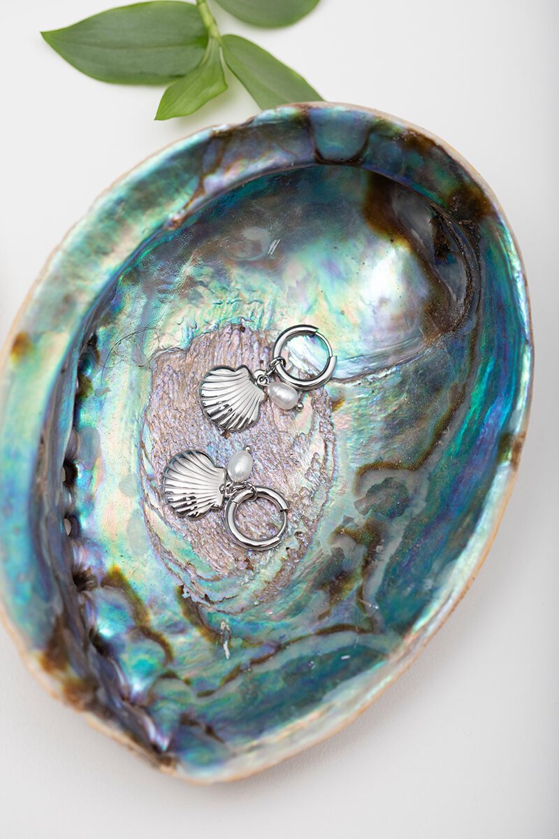 Shell-inspired hoop earrings with a pearl charm — elegant coastal style available in gold or silver finishes.