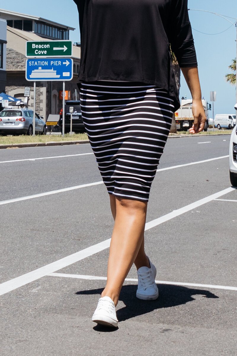 The Alicia Midi Skirt has the length of the century- mid calf.  An affordable basic skirt, great to pull on and wear with your long line floaty tops, or pull it over, and show off your baby bump. Great with a cropped casual tee, sweater or knit jumper or a smart blouse, sneakers, boots, tights, the options are endless!