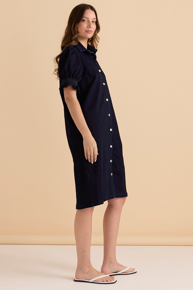 Easy everyday denim with a polished twist. Button-through front, soft feel and subtle scalloped detail. Wear solo with slides for weekend vibes, it is a nice dark denim though so it could be dressed up.