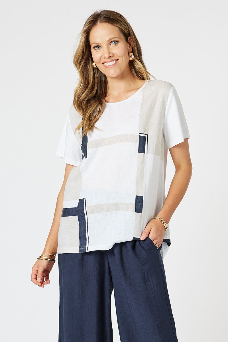 With its soft short sleeves and bold blocked front panel, this top brings just the right amount of interest to your everyday look. A plain back keeps things clean and simple, while the relaxed fit makes it easy to move, style, and love. It’s a throw-on-and-go kind of piece that still looks thoughtfully styled.