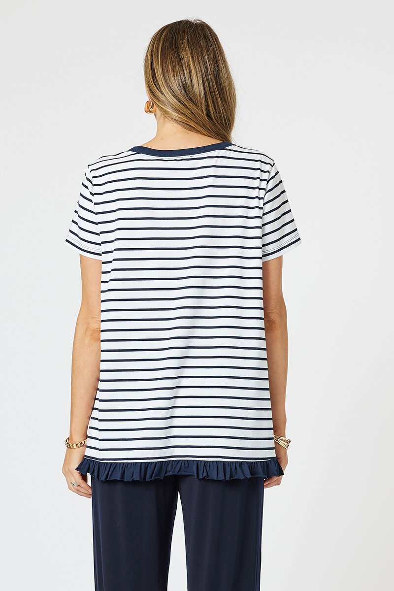 The Clarity Stripe Frill Me Tee is your go-to for easy days with a twist. Designed in a relaxed A-line shape, this striped tee brings a playful touch with its frill hem detail. A classic crew neckline and short sleeves keep it timeless, while side splits offer ease and movement.
