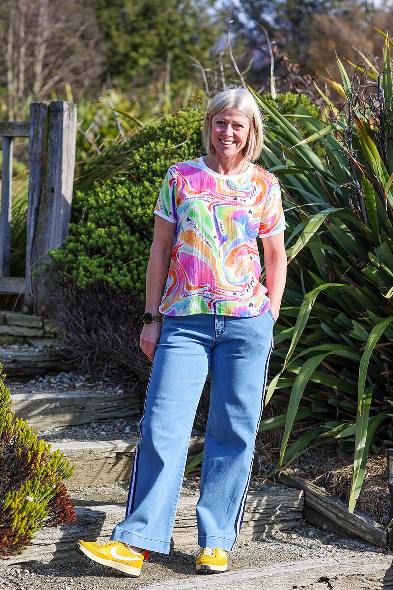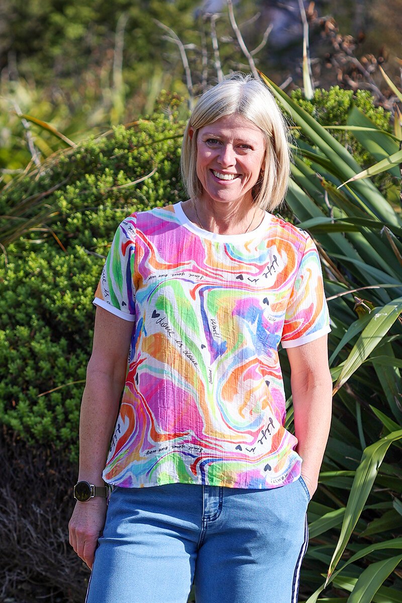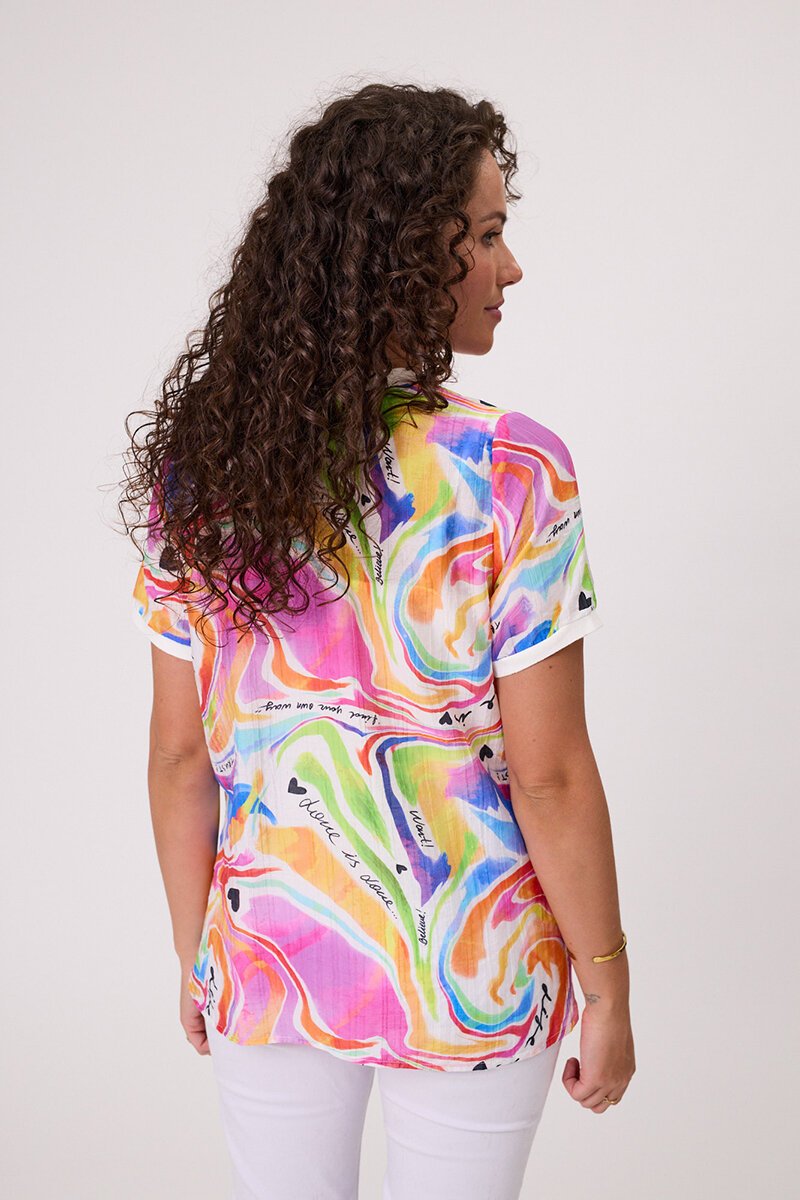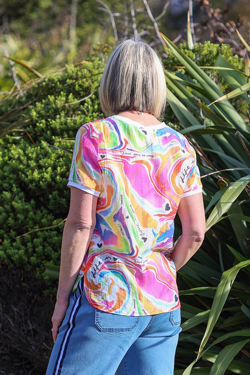 The Classified Life Top is fun, fresh, and full of personality. With its colourful abstract print and playful script details, it brings instant joy to your outfit. Pair it with crisp white pants or denim for an easy, feel-good summer look.