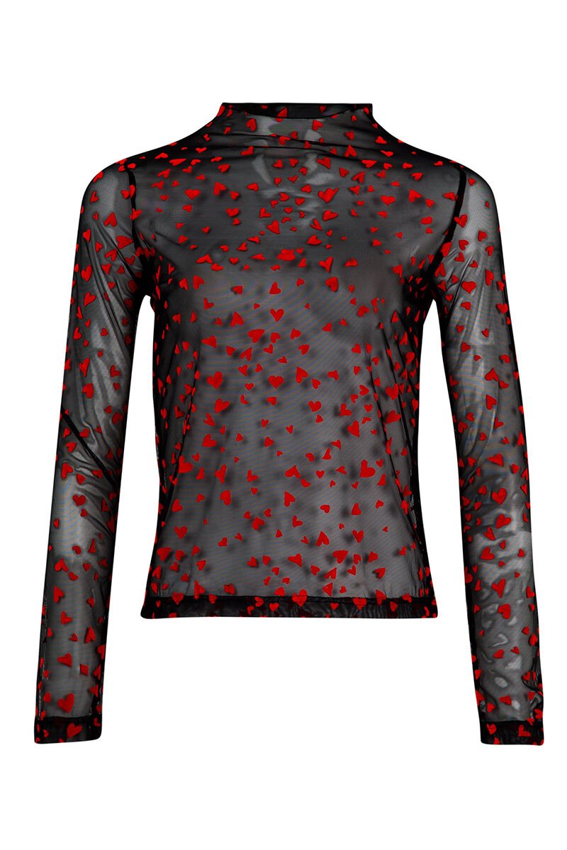Sheer flocked mesh sprinkled with delicate hearts, this long sleeve top features a soft baby-lock neckline for a feminine finish. Playful yet polished, perfect layered or worn solo.
