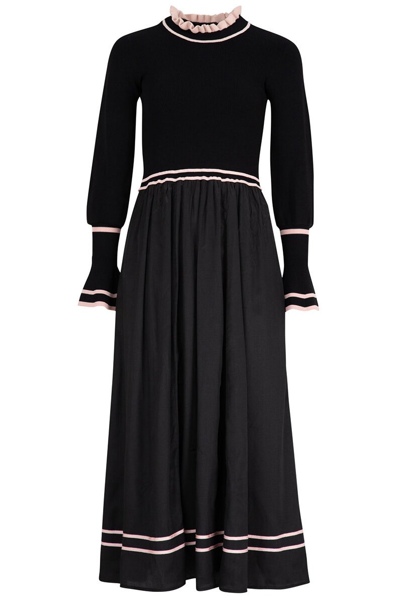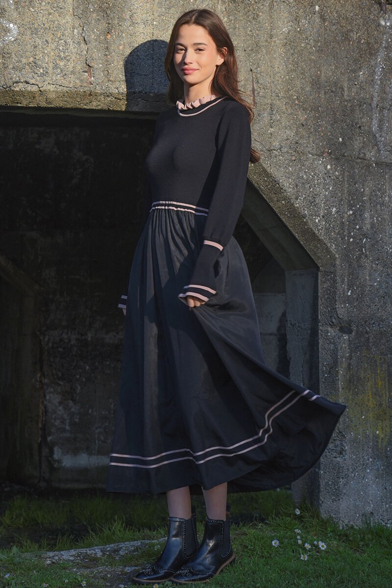 The Coop High Expectations Dress blends soft knit comfort with feminine detailing. A fitted ribbed knit bodice meets a full gathered skirt, finished with delicate contrast trims and a frilled neckline for a polished look that moves beautifully from day to evening.