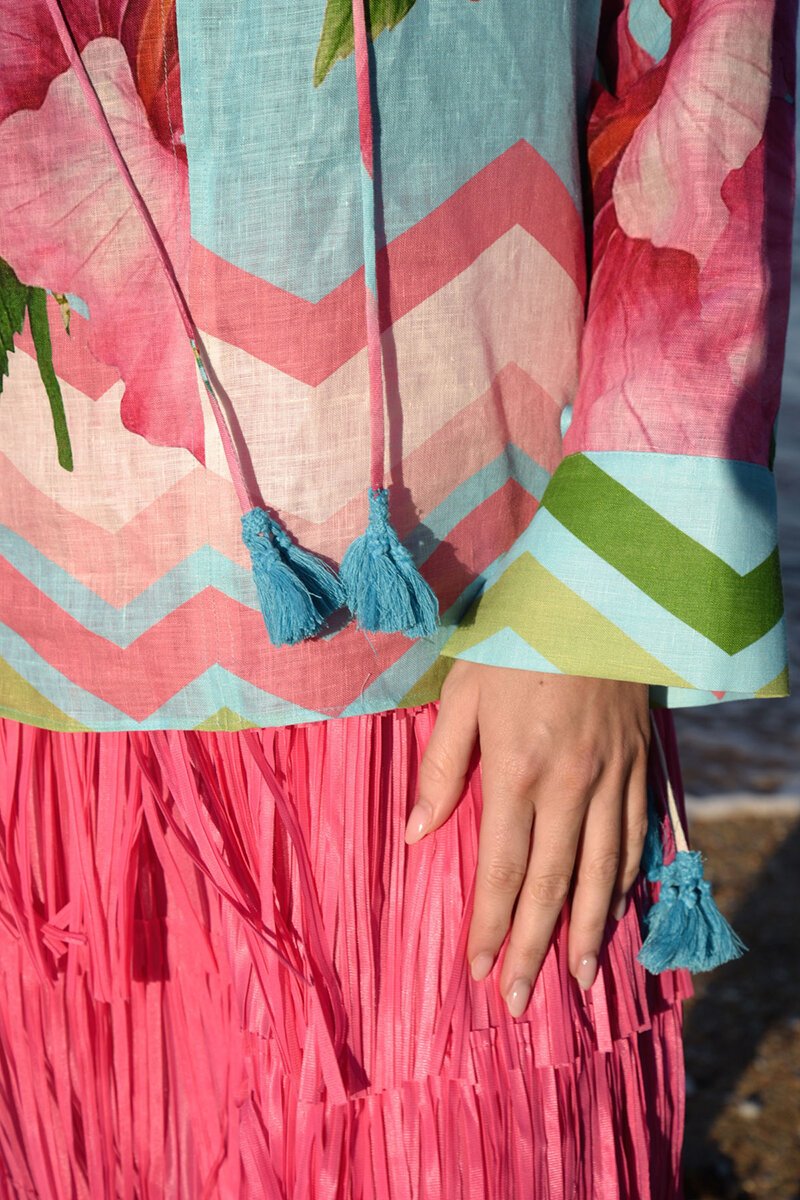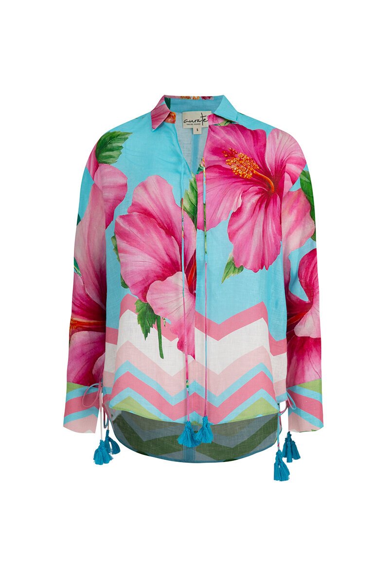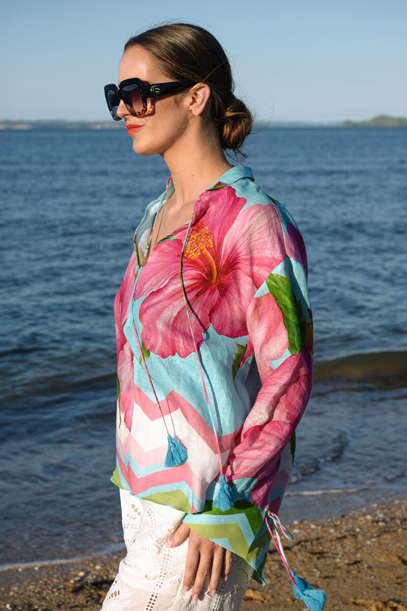 The Curate Always Within Reach Top is a walking holiday mood — bold, bright, and made for sunshine. Crafted in airy linen with oversized hibiscus blooms and tassel-tie details, it’s the kind of piece that turns heads from brunch to beach. Pair it with wide-leg pants or linen shorts for instant vacation energy.