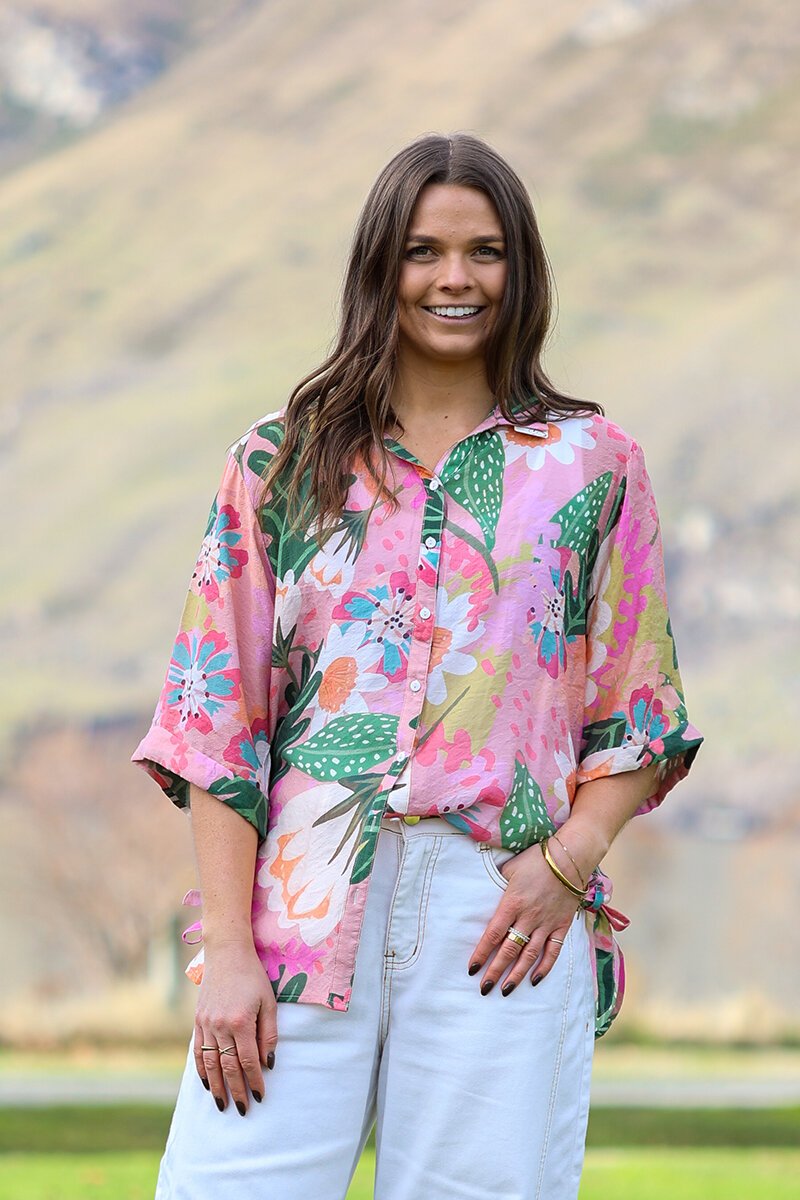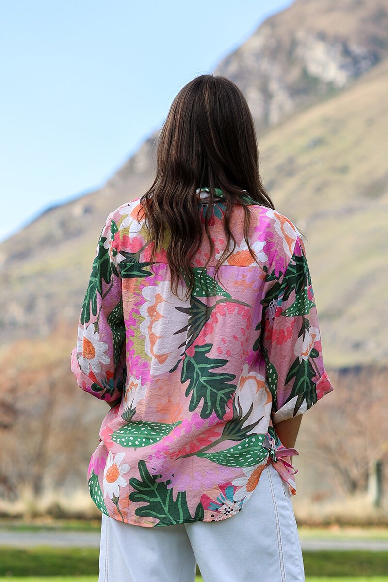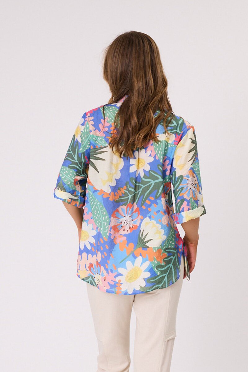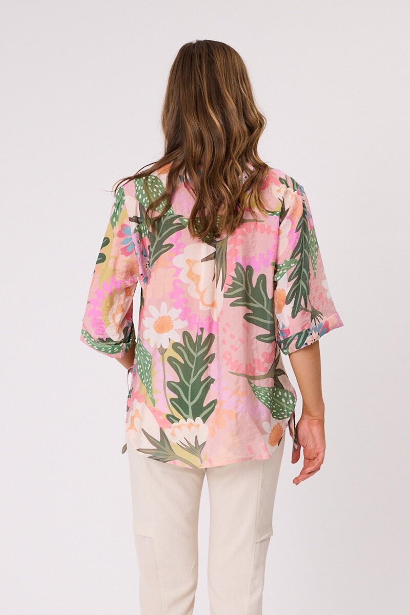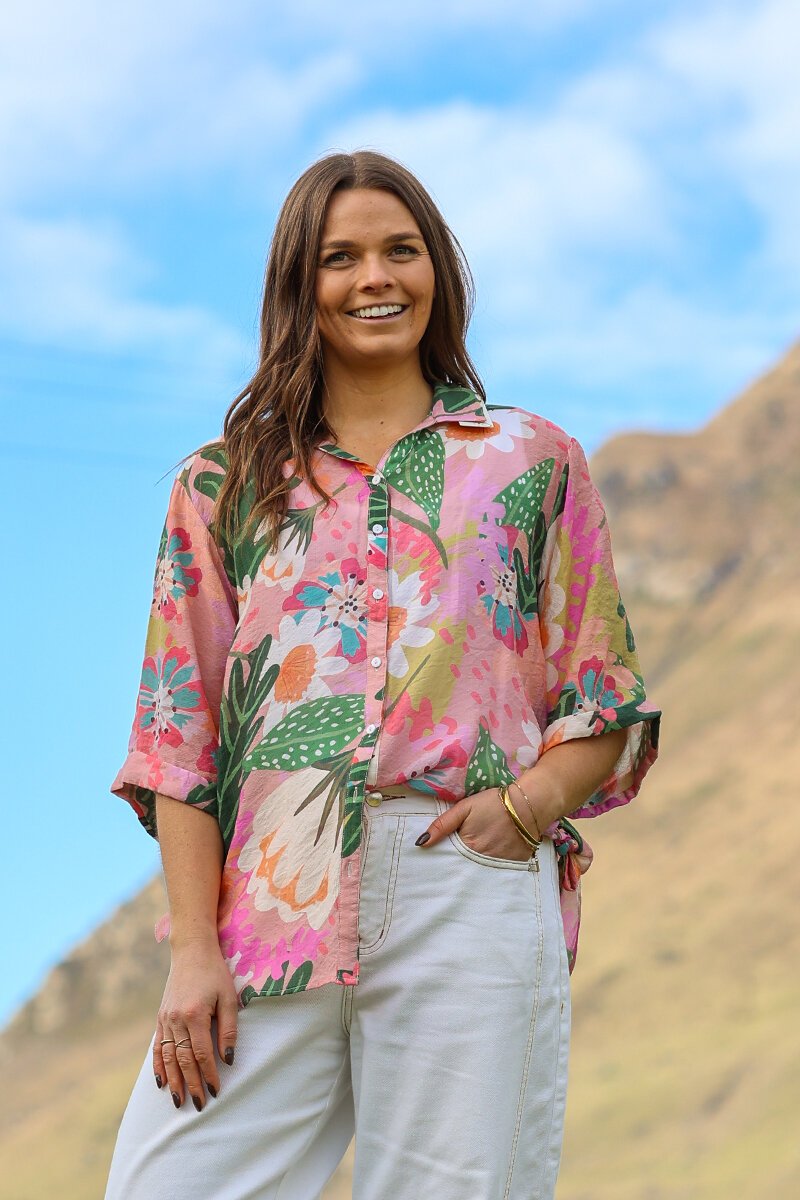 The Democracy Sofia Printed Tie Side Shirt is a playful button-up with a fresh, eye-catching print. Designed with a relaxed fit and a tie-side detail, it brings a touch of fun to your everyday style. Perfect with jeans or shorts for summer days.