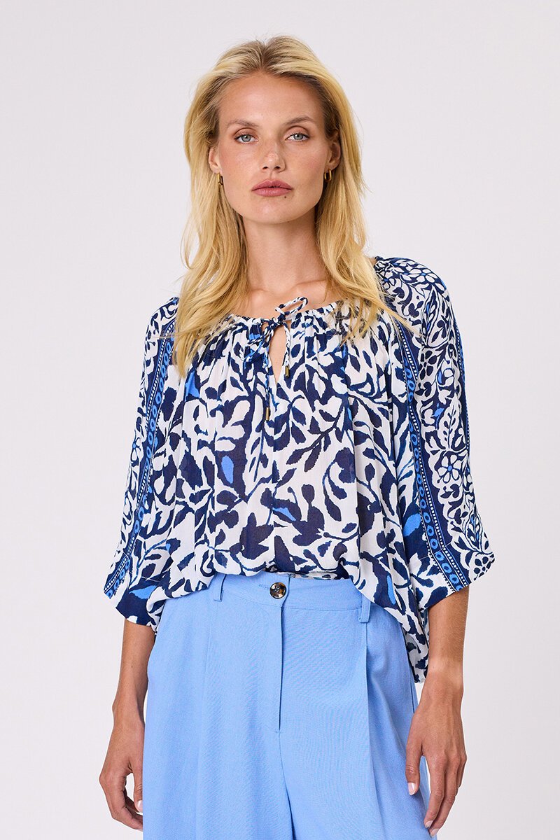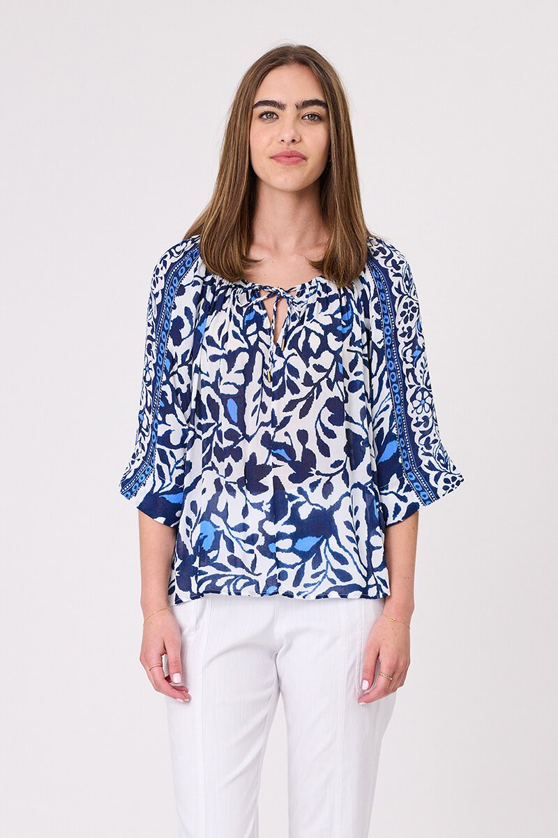 Effortless and eye-catching, the Honor Top pairs a relaxed silhouette with a striking blue print. The gathered neckline with tie detail and 3/4 sleeves add a breezy, feminine feel—perfect for both casual days and dressier evenings.