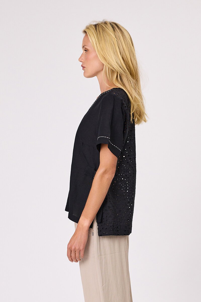 Easy elegance meets intricate detail in the Lotus Top. Crafted with a soft V-neckline and delicate contrast stitching, it features a stunning broderie anglaise back with an adjustable D-ring tie for shape. A relaxed fit that’s equal parts pretty and effortless.