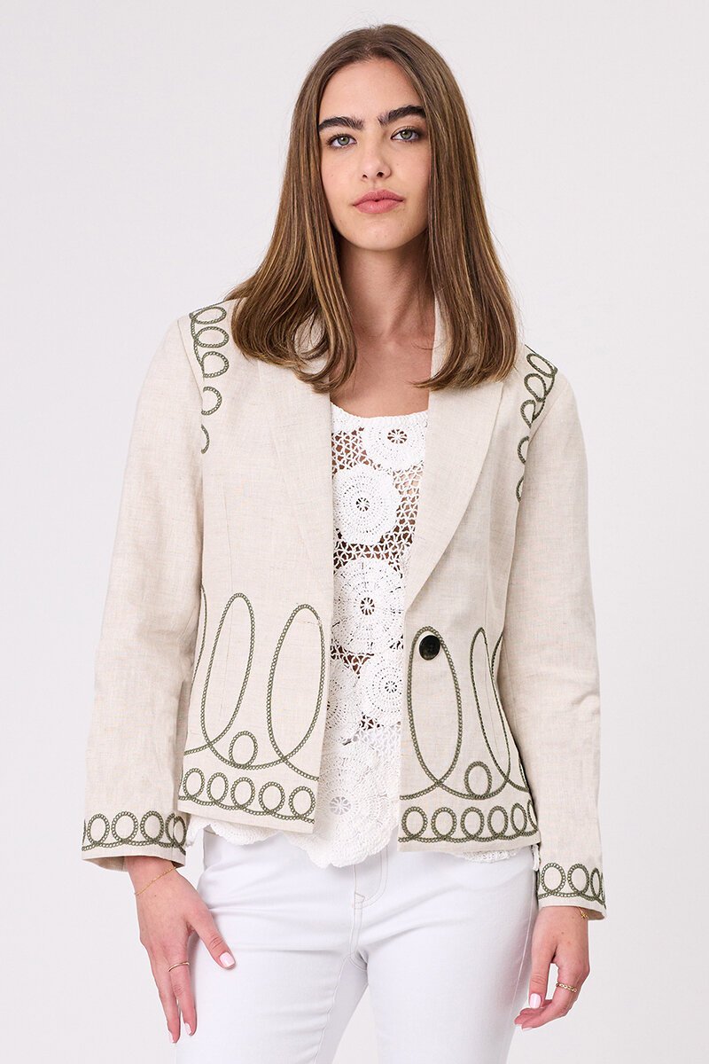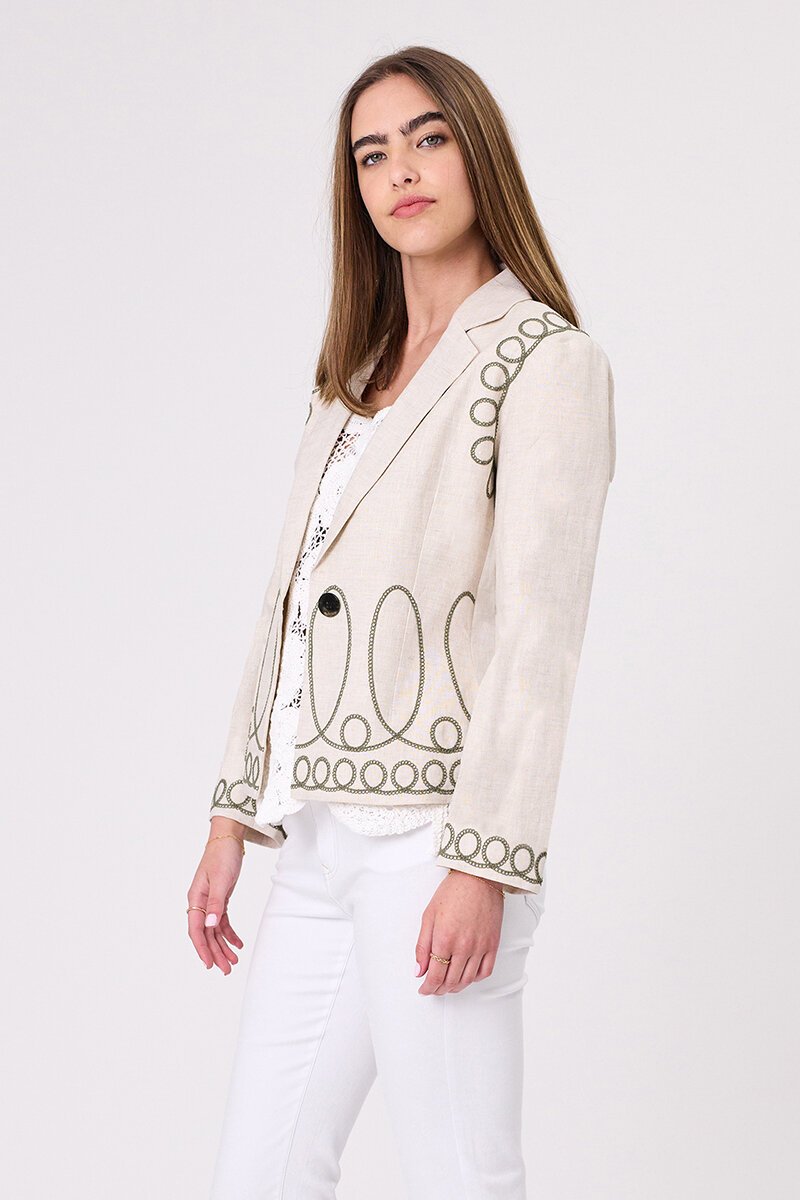 The Nova Jacket is your shortcut to easy sophistication. In a soft neutral linen blend, it’s elevated with statement embroidered loops for a playful twist on classic tailoring. Finished with a single button closure, it works just as well with jeans as it does over dresses.