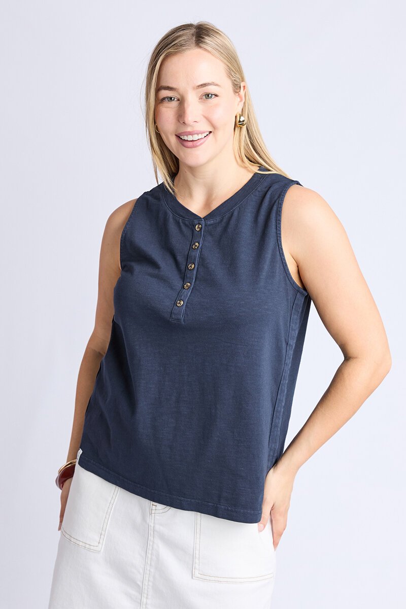 The Elm Elysian Tank is an easy everyday essential with a laid-back edge. Featuring a sleeveless cut, button front detail, and soft cotton slub fabric, it’s made for warm days and relaxed weekends. Pair it with shorts or denim for instant cool.