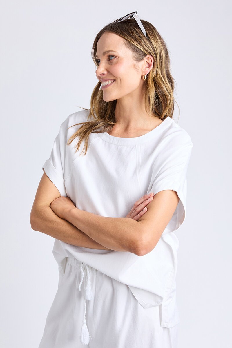 The Elm Maura Top is an easy everyday tee with a relaxed fit and rolled sleeves. Soft, breathable and made for effortless styling with your favourite shorts, denim or skirts.