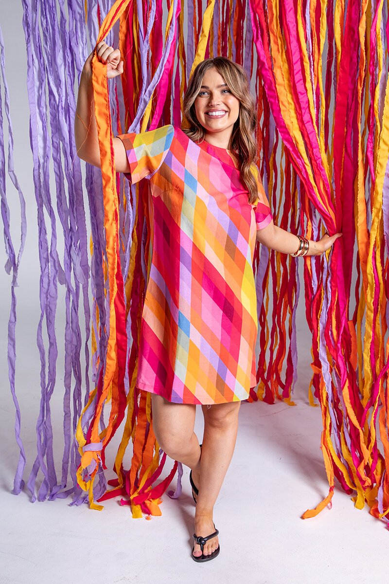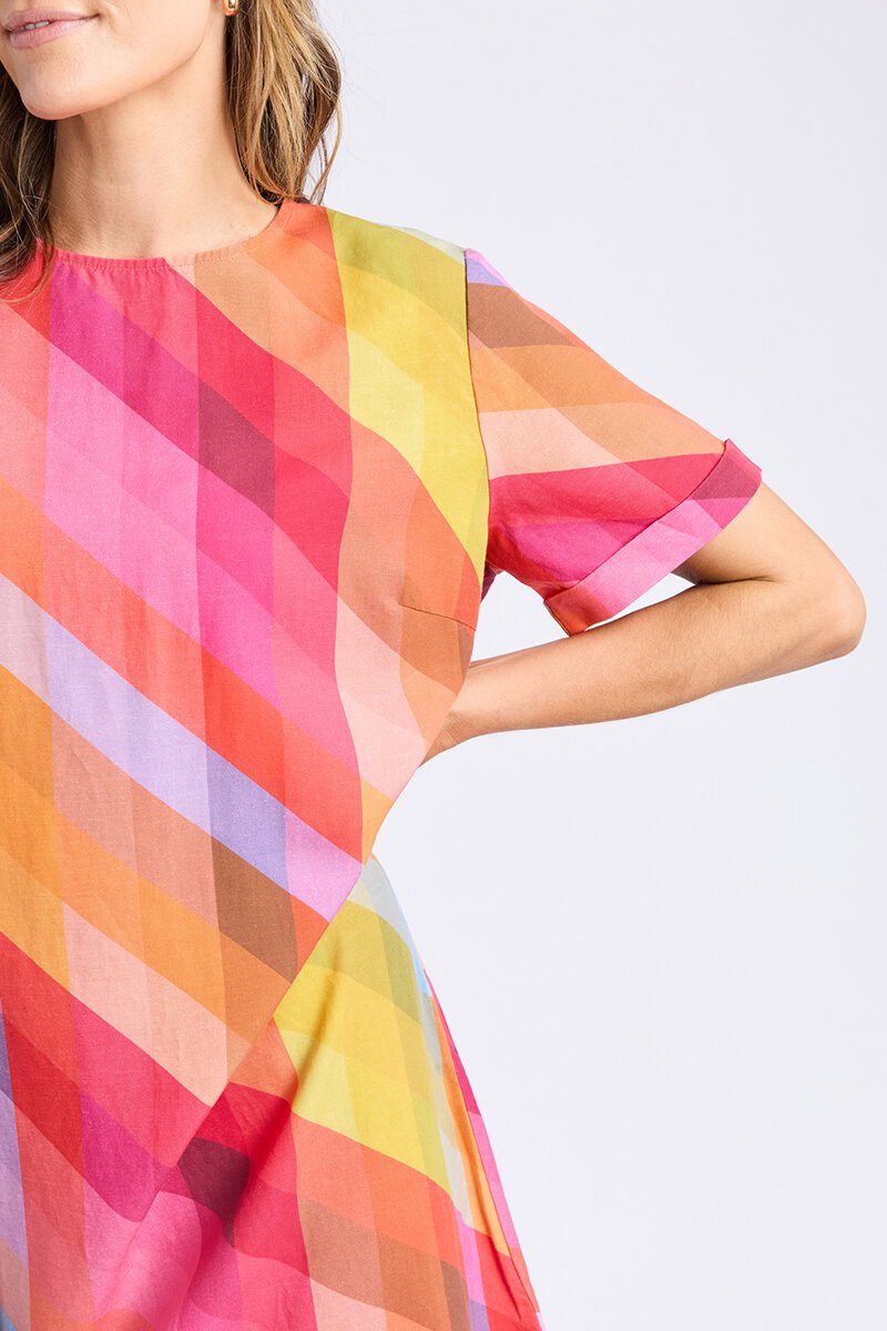 Bright, fun, and ready for good vibes only, the Elm Rena Dress brings instant colour to your day. The relaxed shift shape keeps it easy, while the bold diagonal print brings the party. Just add slides and a smile.