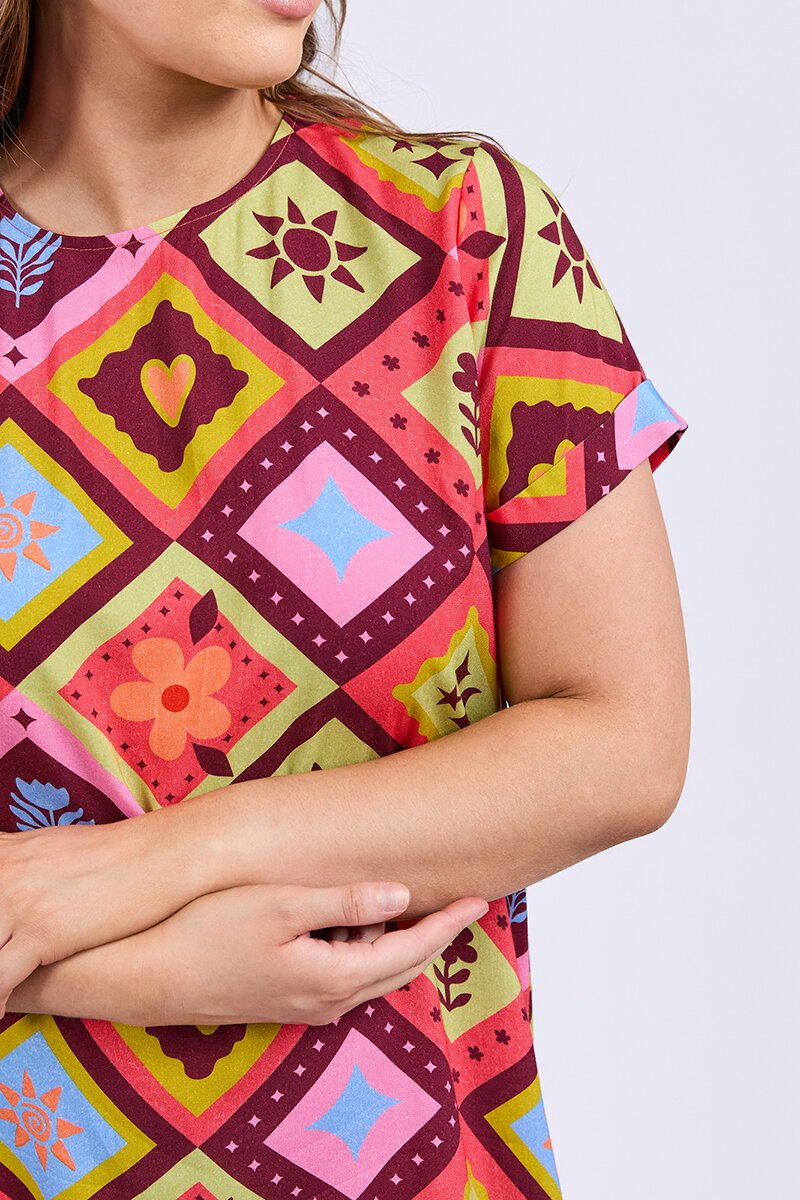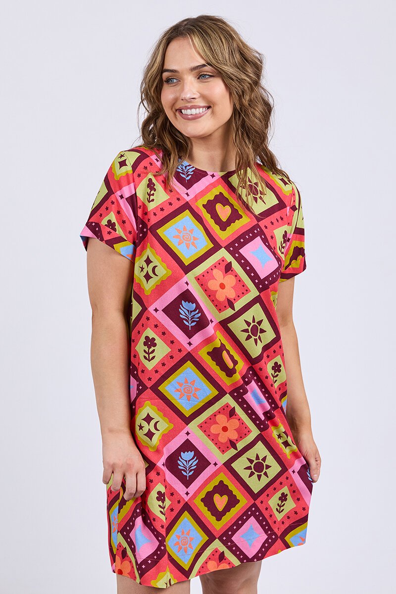 Bright, bold, and made for fun days — the Elm Rhode Dress is all about easy wear with big personality. The relaxed tee silhouette keeps things comfy, while that playful print brings instant summer energy to your look.