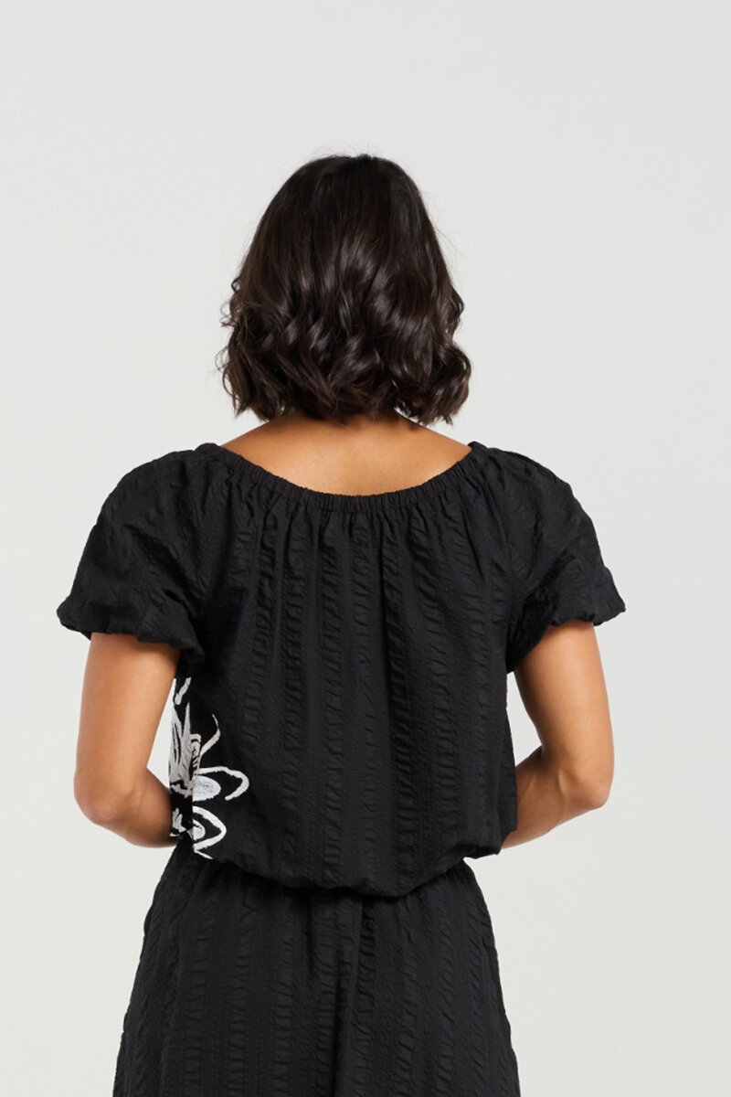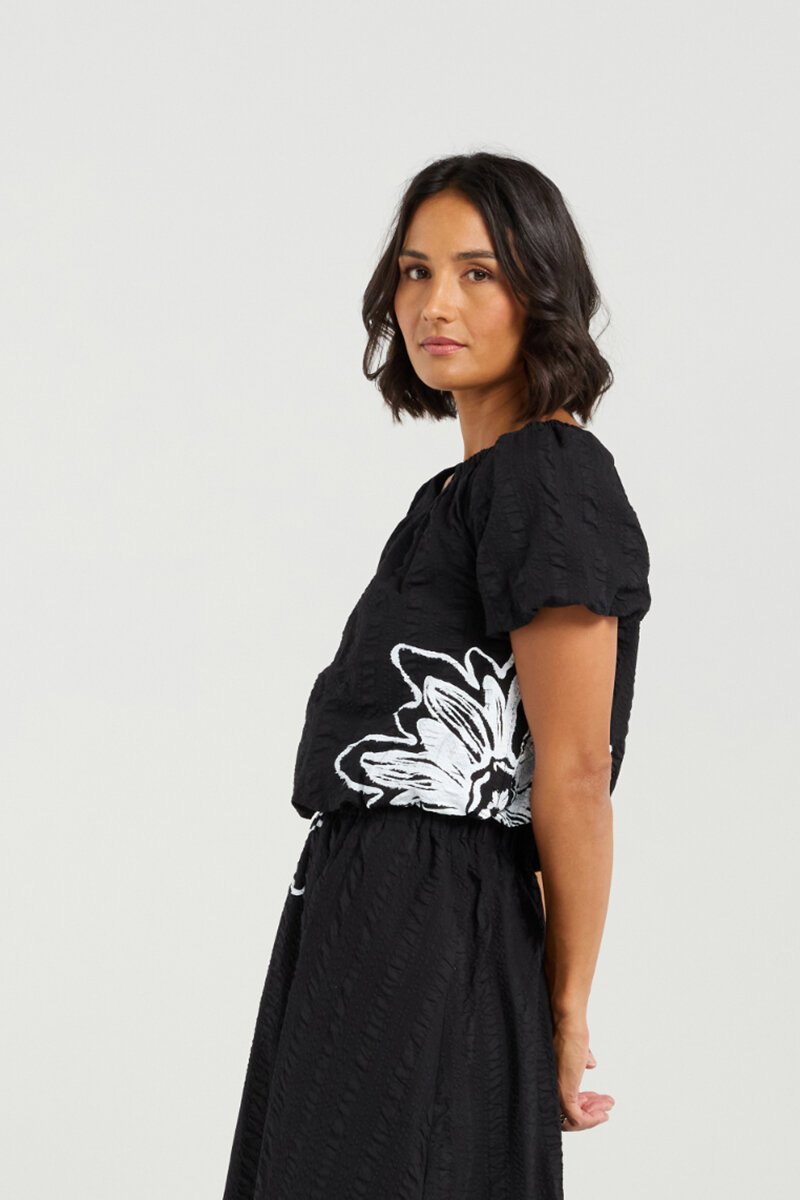 The Et Alia Daisy Crop Top is a playful yet versatile piece, featuring bold floral detailing that makes a statement. Its relaxed cut and lightweight fabric make it easy to pair back with skirts or denim for an effortlessly put-together look.