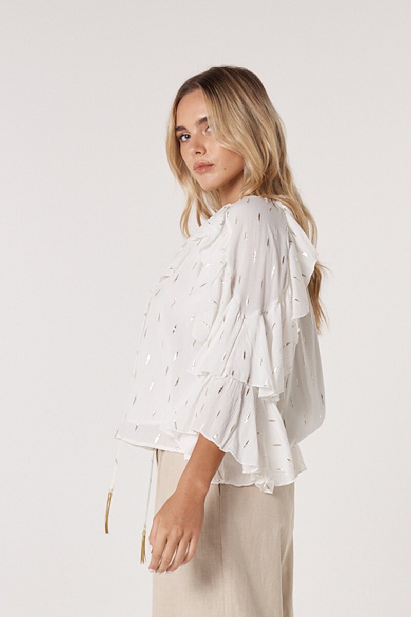 Romantic and light as air, the Fate + Becker Delia Ruffle Top is a feminine blouse with soft metallic accents and ruffled sleeves. The tie front neckline lets you wear it loose or in a bow, depending on your mood. Floaty, flattering and fun to wear.