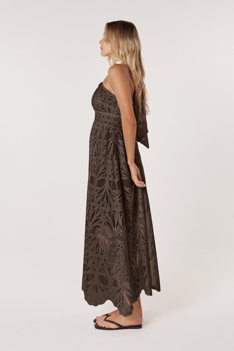 The Fate + Becker Elara Broderie Dress is a statement dress with a twist—literally. Featuring a crossover halter neckline and keyhole detail, it’s beautifully balanced with a full embroidered skirt. A true showstopper for summer events, dinner dates or days you just want to feel incredible.
