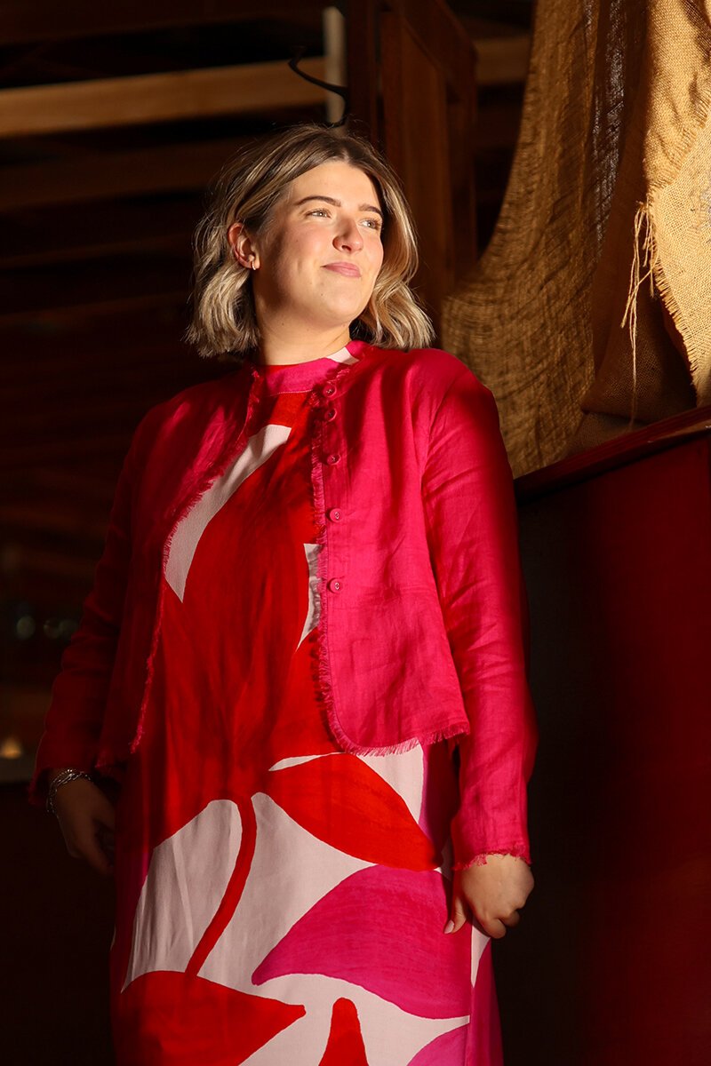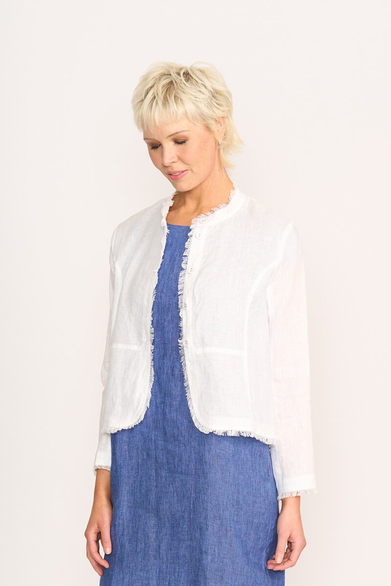 The Foil Fringe Festival Jacket is a lightweight linen layer with a playful twist. Featuring raw edge detailing and a flattering cropped shape, it’s the perfect finishing touch over dresses or tanks — adding easy polish to your warm-weather looks.