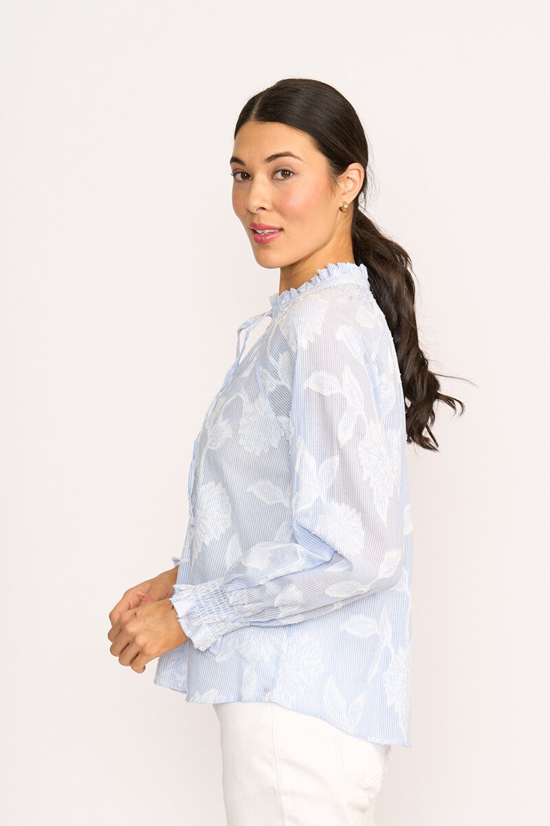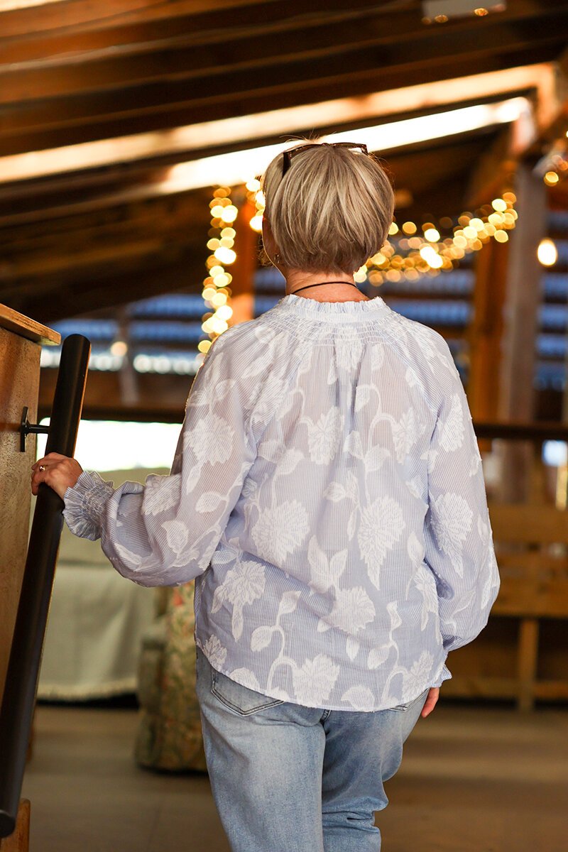 Relaxed yet refined, the Foil Just Chillin' Floral Stripe Top blends easy everyday wear with subtle detail. Featuring a soft gathered neckline, button placket, and gentle blouson sleeve, it’s the perfect partner for denim or linen pants.