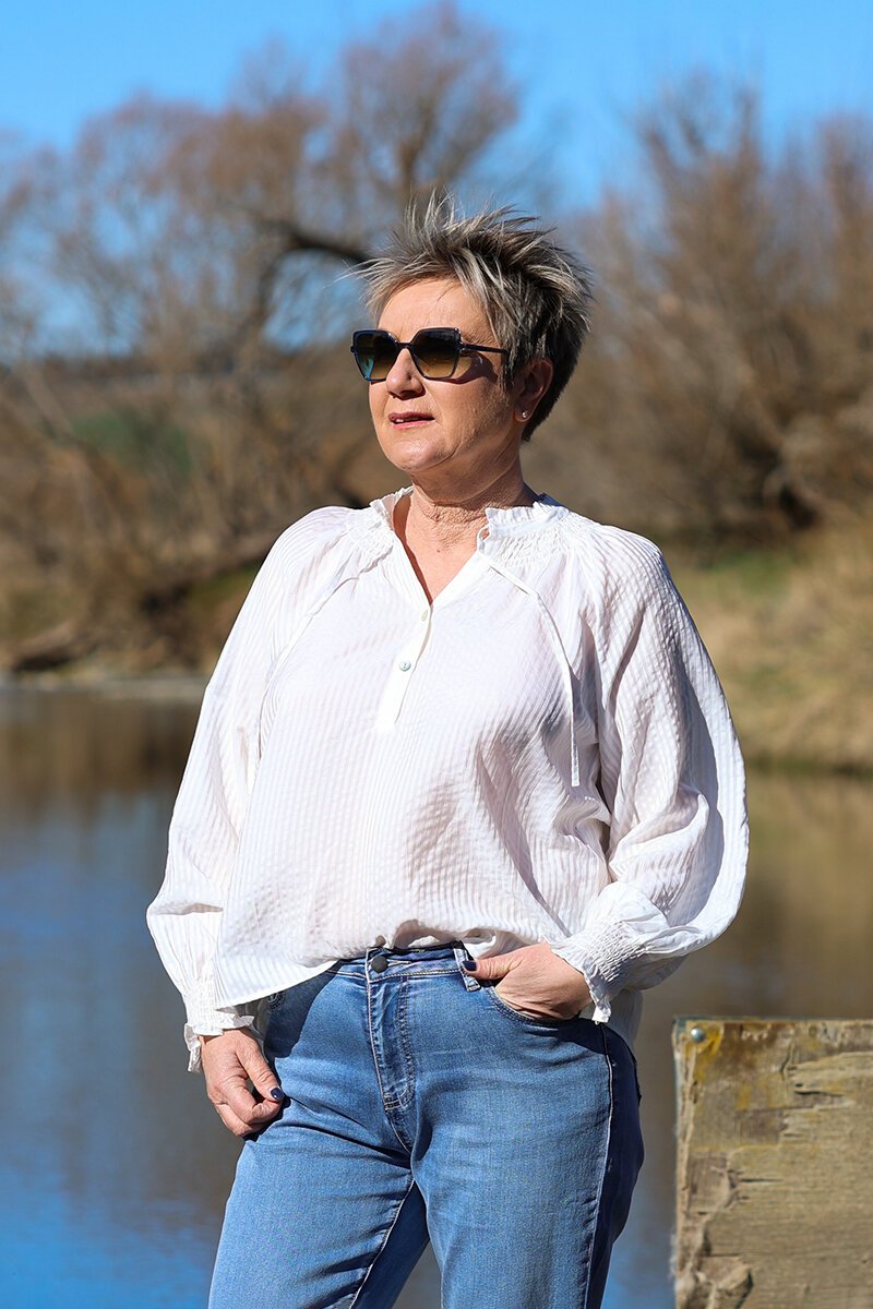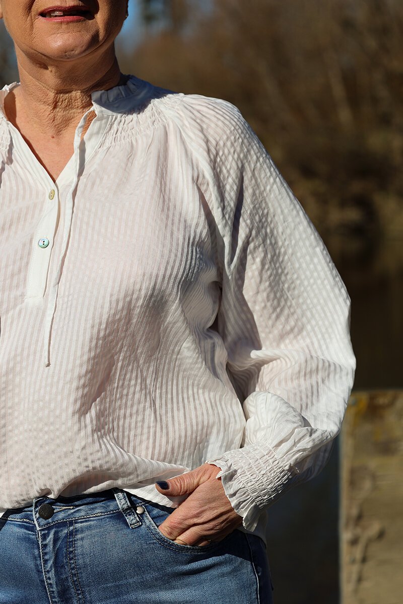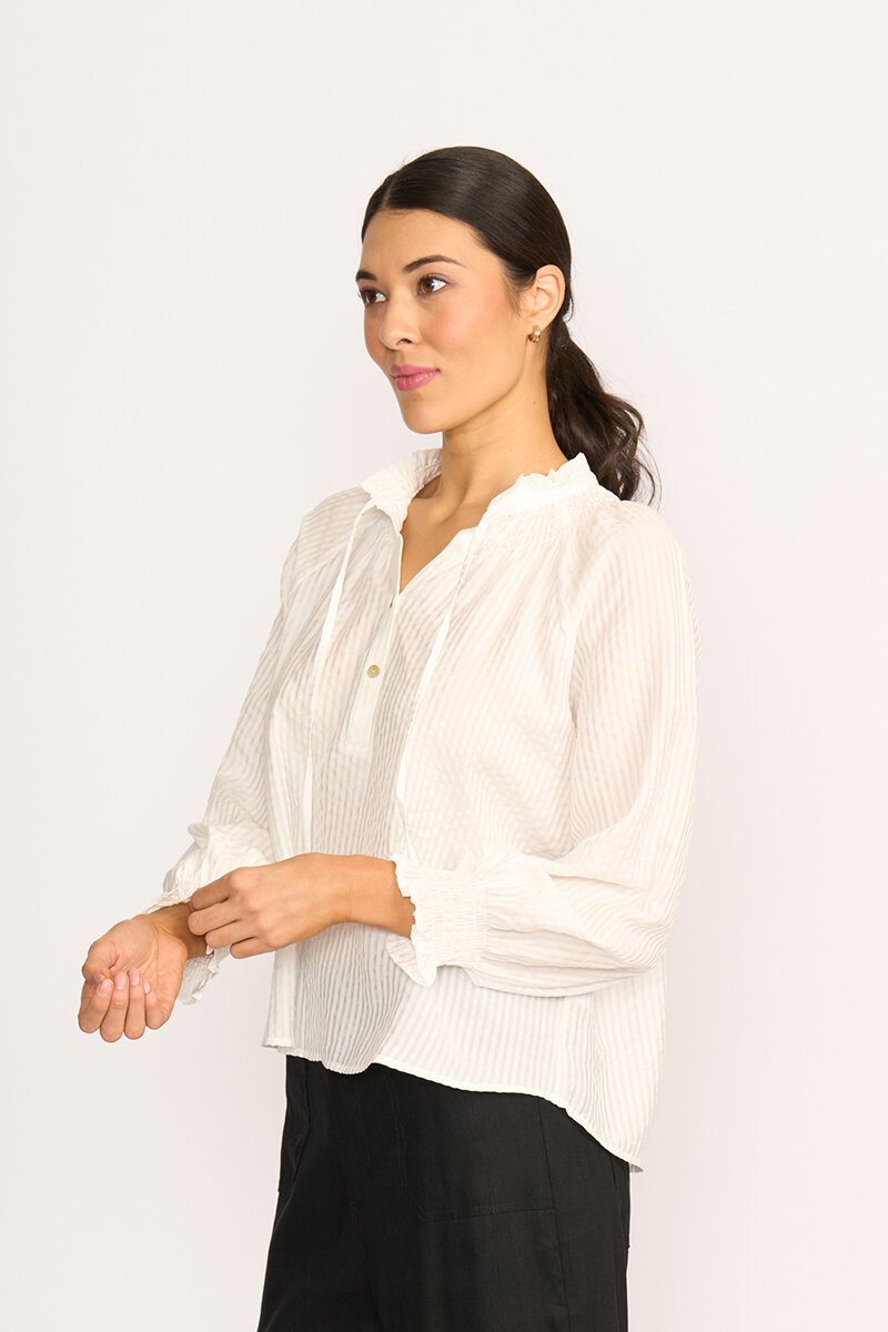 The Foil Just Chillin' Stripe Top is relaxed yet refined. With soft gathers at the neckline, elastic cuffs, and a curved hem, it’s the kind of effortless piece that goes with jeans, trousers, or layered under a blazer for a twist.