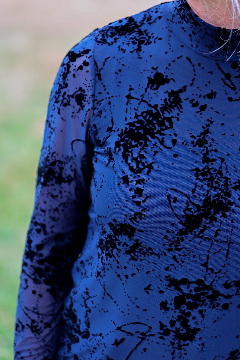 This long sleeve polo neck top by Foil features a mesh base with a velvet touch pattern, giving it a playful yet elegant vibe. It’s perfect for layering or wearing solo. Pair it with jeans for a casual look or dress it up with tailored pants.