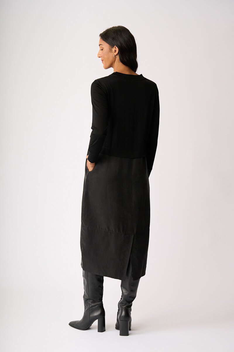 Soft, fluid and beautifully balanced. The Mix Things Up Dress blends a gentle knit bodice with a flowing woven skirt, creating shape without cling. Feminine, flattering and effortlessly polished for everyday wear.