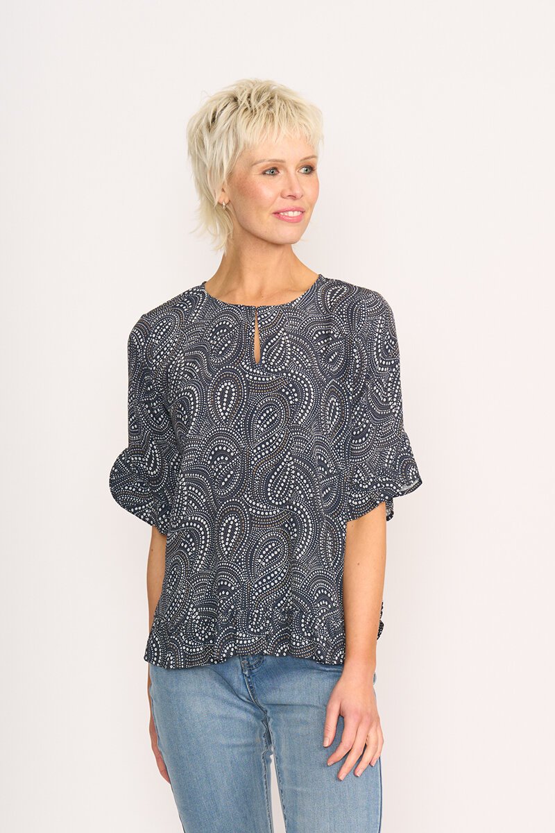 The Foil Ruffle Sleeve Top is a light, easy piece with just the right amount of detail. Featuring soft gathers, fluttery sleeves, and a keyhole neckline, it’s a relaxed yet polished style that pairs perfectly with jeans or linen pants.
