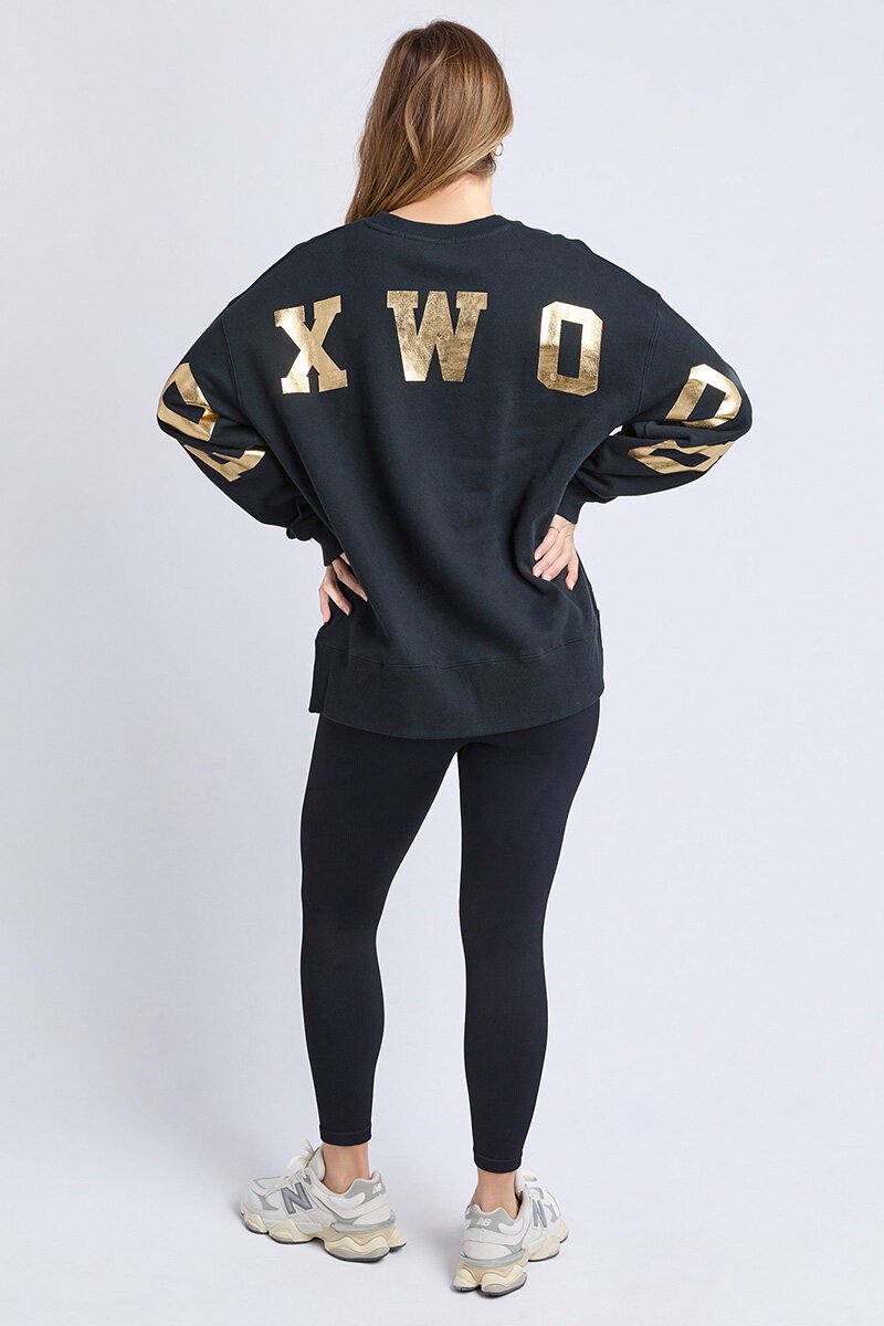 Your favourite Foxwood crew is back again! Black with a gold metallic print across the front and back. Easy to wear with leggings on the weekend or paired with your favourite jeans.