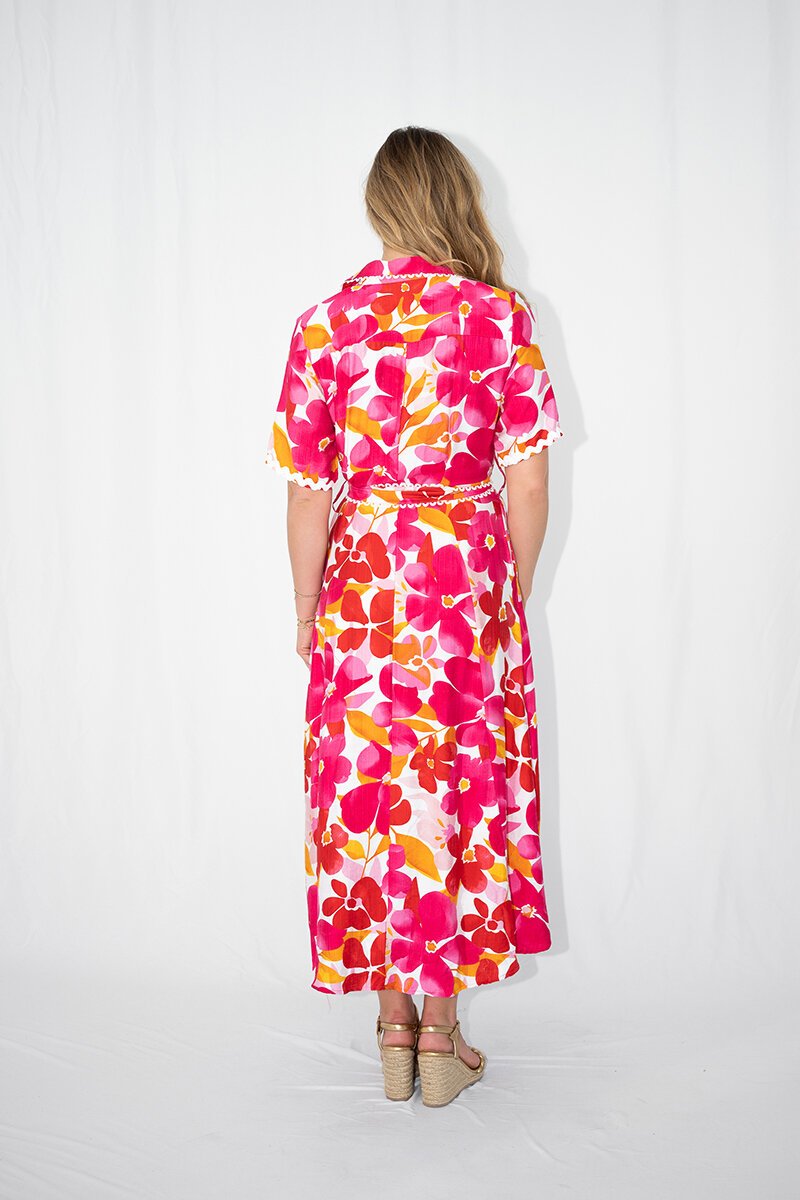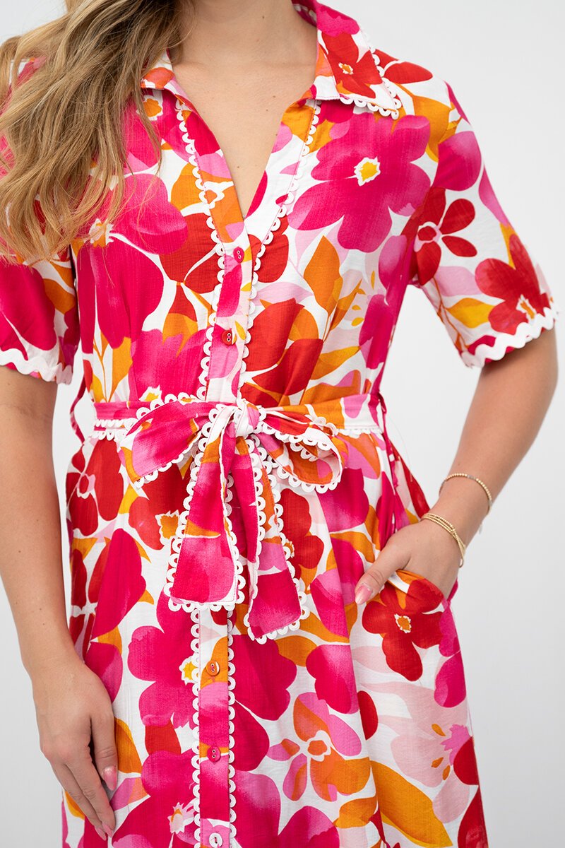 The Fria The Label Floral Lace Trim Midi Dress is a standout summer piece, covered in vibrant pink and orange florals with sweet scalloped trim. The soft button-down silhouette and waist tie create an easy, flattering shape for sunny days and celebrations.