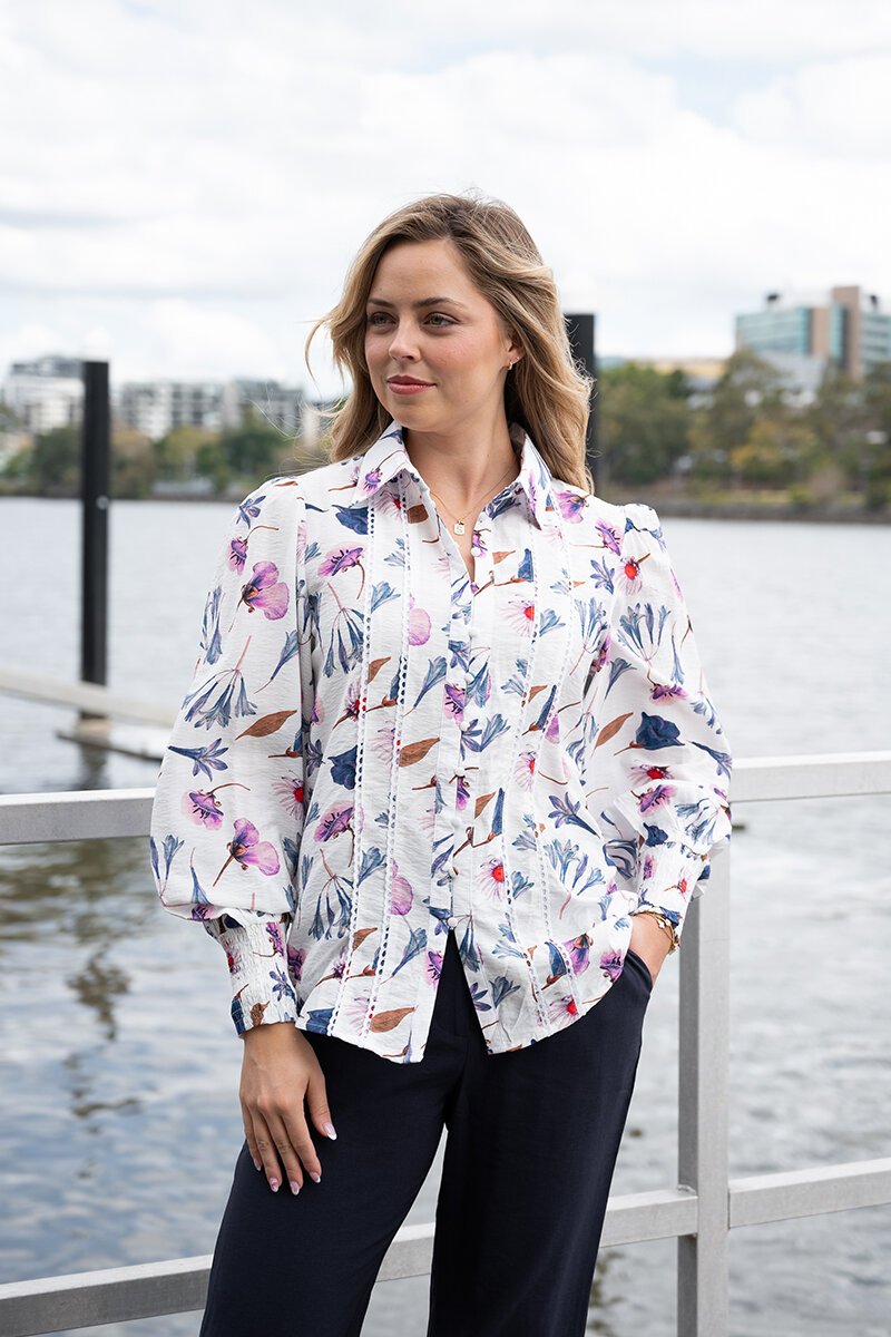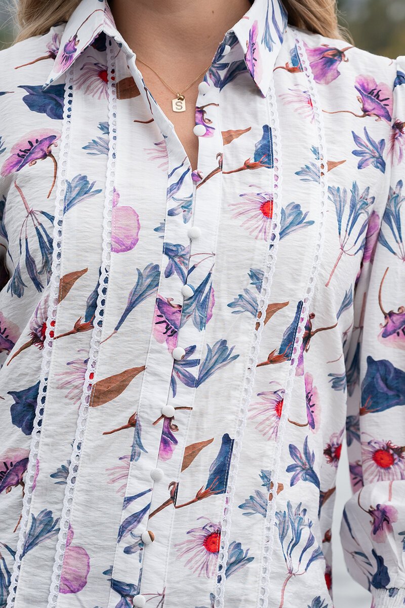 The Fria The Label Flower Lace Blouse is a beautifully detailed piece that feels equal parts romantic and refined. With soft florals, lace-trim accents, and statement sleeves, it’s perfect for pairing with tailored pants or denim — a true standout for spring days or evenings out.