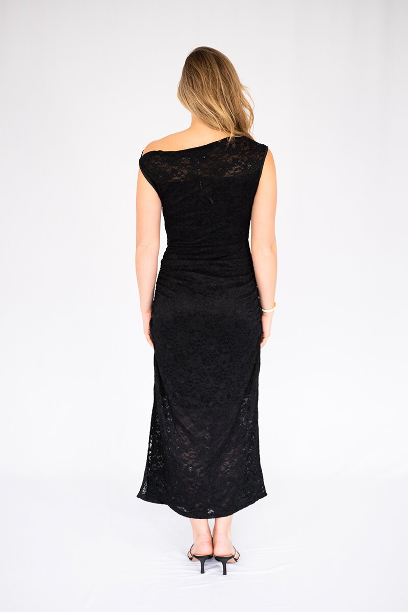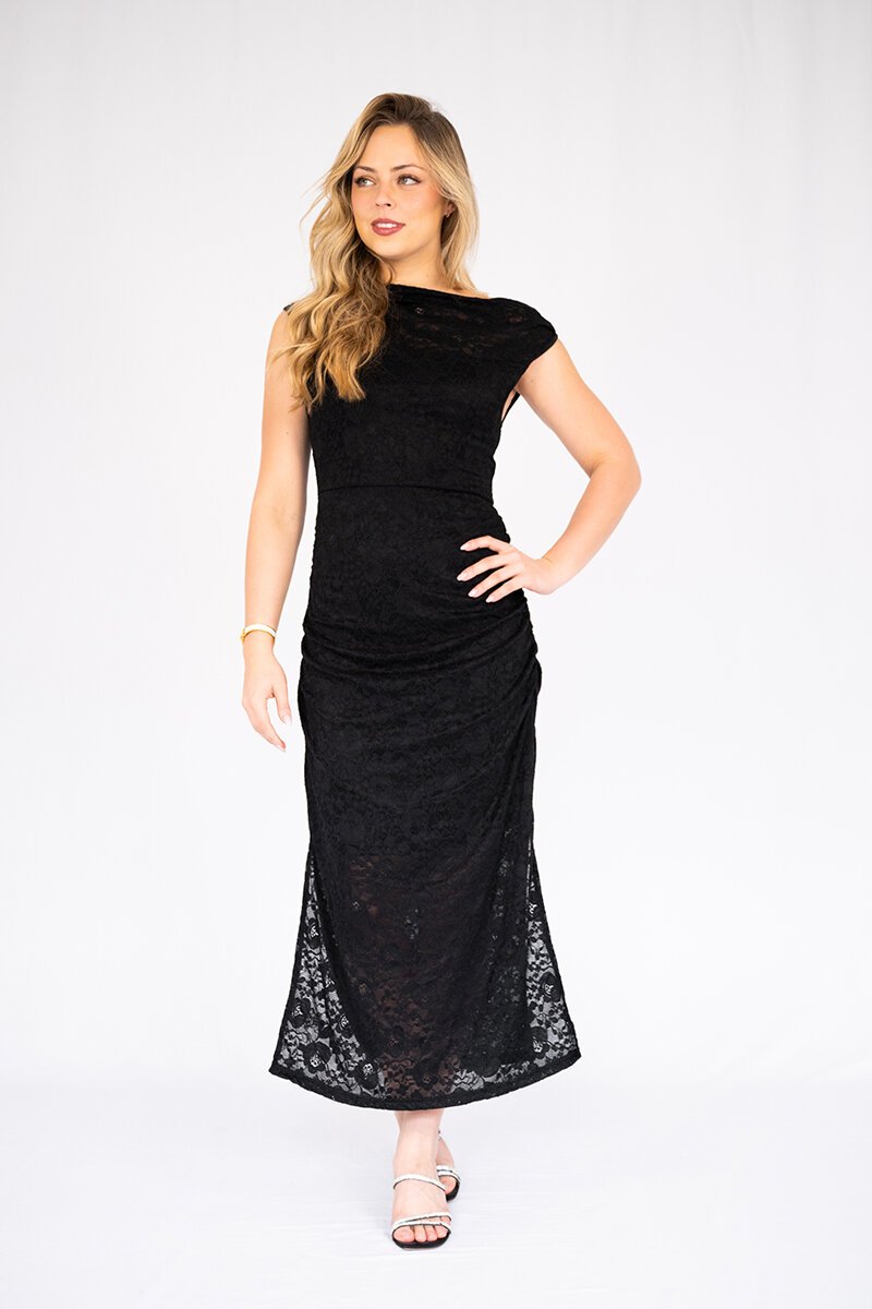 The Fria The Label Lace Side Ruched Dress is pure sophistication. Cut in a fitted silhouette with delicate lace overlay and flattering side ruching, it’s the perfect occasion piece. Add heels and minimal jewellery for timeless evening elegance.
