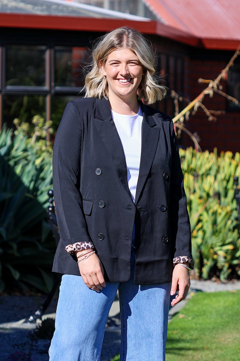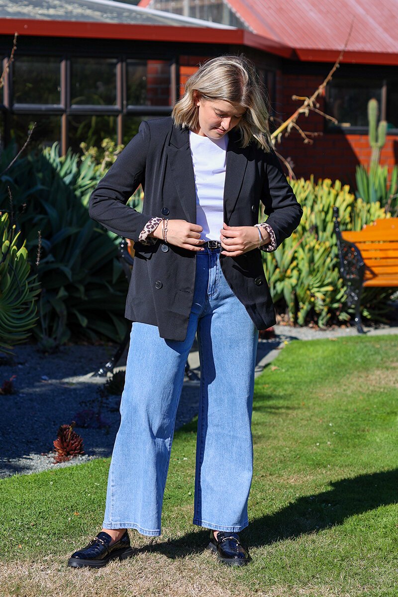 The Fria The Label Leopard Lined Blazer takes classic tailoring up a notch with a bold animal print lining. The double-breasted silhouette gives it a polished feel, while the contrast lining adds a fun twist when you roll up the sleeves. Whether styled for the office or thrown over denim for an elevated casual look, this blazer is the perfect mix of structured and statement-making.