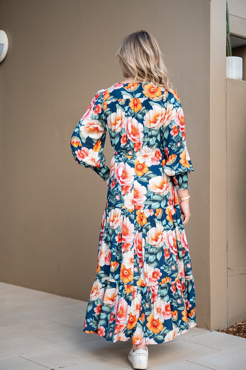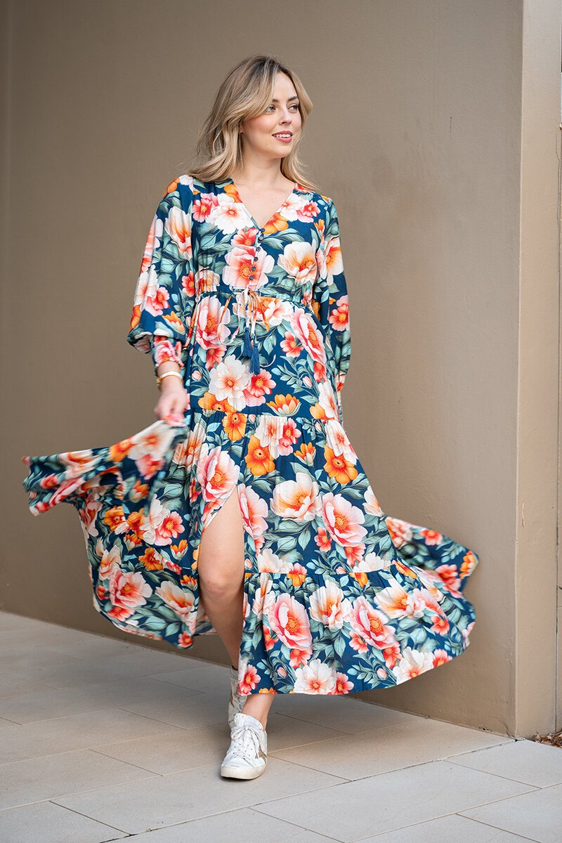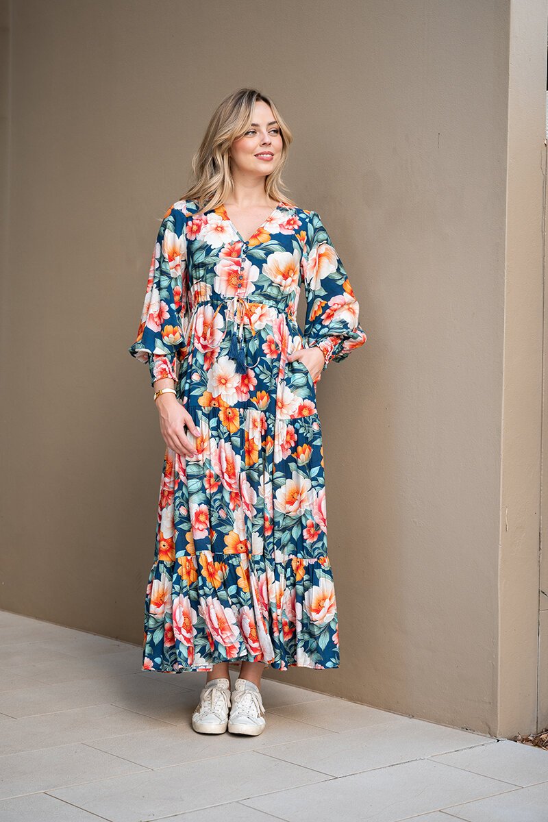 The Fria The Label Vintage Floral Selma Dress brings romance and ease together. With a cinched drawstring waist, tiered skirt, and flowy sleeves, it’s designed to flatter and move with you—perfect for garden parties, brunch dates, or barefoot summer evenings.