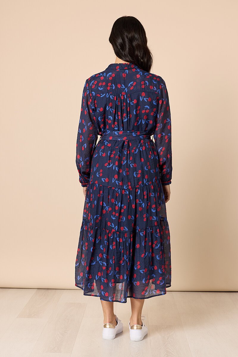 Gordon Smith Cherry Delight Dress is a floaty, feel-good midi length for easy everyday wear. Featuring a flattering tie waist and tiered skirt, it moves beautifully and works just as well with sneakers or boots.