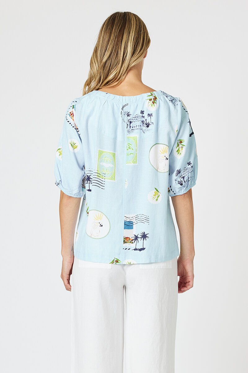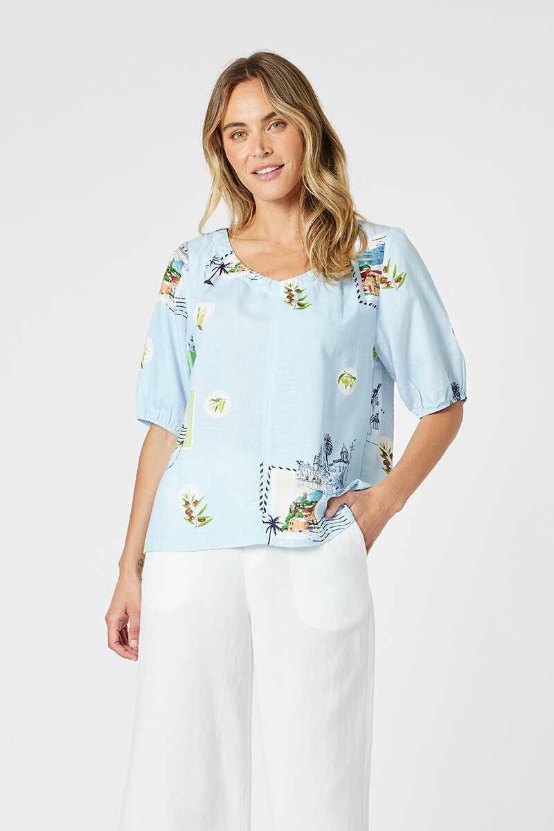 The Destination Top is effortlessly stylish with a touch of wanderlust. Crafted from a soft linen blend, it features a flattering V-neckline, elbow-length elasticated sleeves, and a relaxed silhouette. A playful postage stamp print adds charm to this versatile piece.