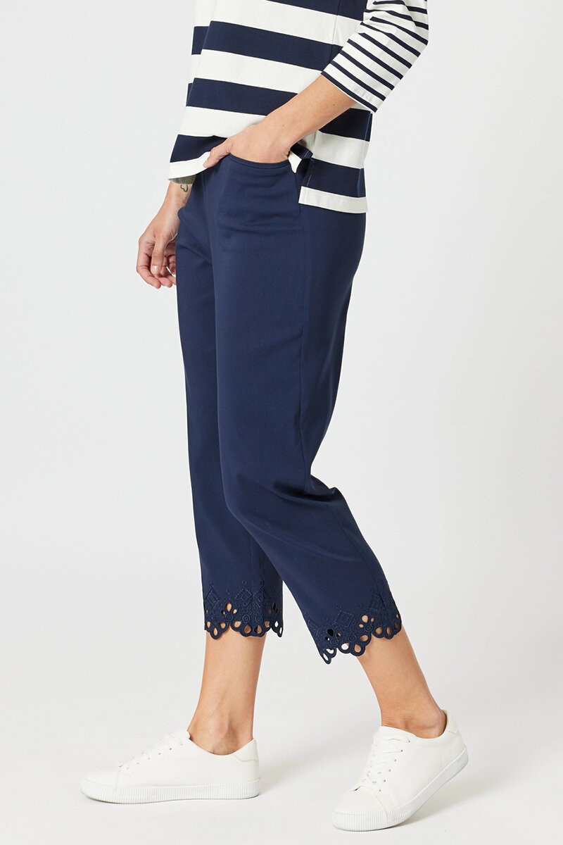 The Gordon Smith Fleur Pant is your easy everyday go-to with a feminine twist. Made from soft stretch fabric for all-day comfort, it features a cropped leg and delicate embroidered hem detailing that adds a little something special to your off-duty look.