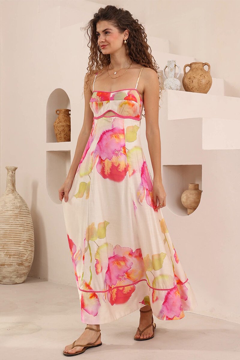 The Iris Maxi Pink Print Maxi Dress is your dreamy summer standout—light, flowy, and covered in a vibrant painterly print. With delicate straps and a soft, swishy skirt, it’s made for warm days, long lunches, and holiday sunsets.