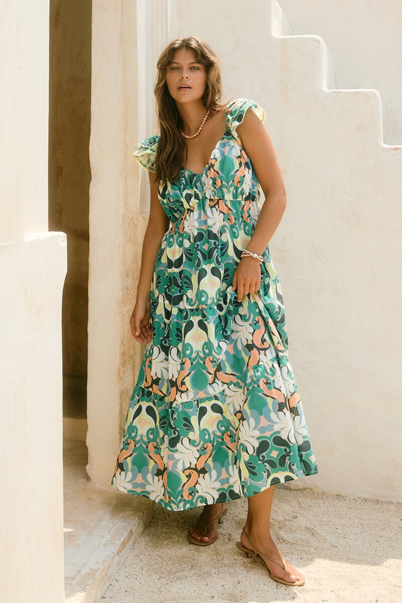 The Isle of Mine Aurora Frill Tank Dress is a breezy tiered maxi with a flattering gathered bust and playful frilled shoulder straps. Designed with an easy fit and side pockets, it’s the perfect warm-weather dress for everyday or holiday escapes.