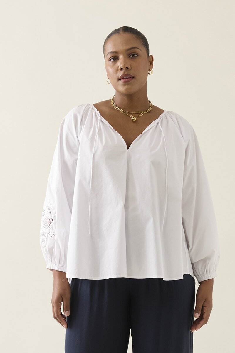 The Isle of Mine Nilsa Blouse is an effortless staple with a feminine edge. Featuring relaxed sleeves with delicate embroidery cut-outs, a soft neckline with ties, and an easy, flowy silhouette—perfect for everything from workdays to weekends.