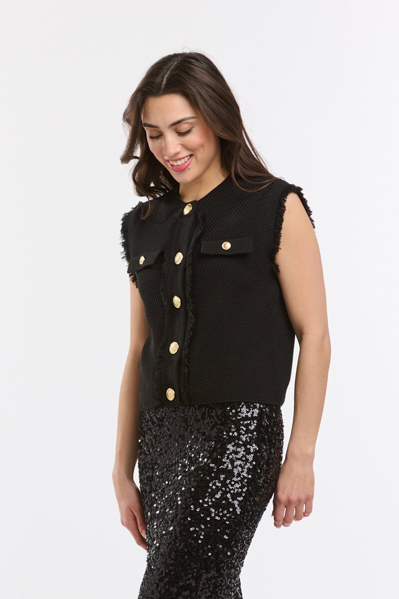 The Italian Star Coco Vest is a chic layering piece with a modern twist. Featuring bold gold buttons, raw-edge detailing, and a structured fit, it’s the perfect style to wear over a tee or blouse for a polished yet playful look.