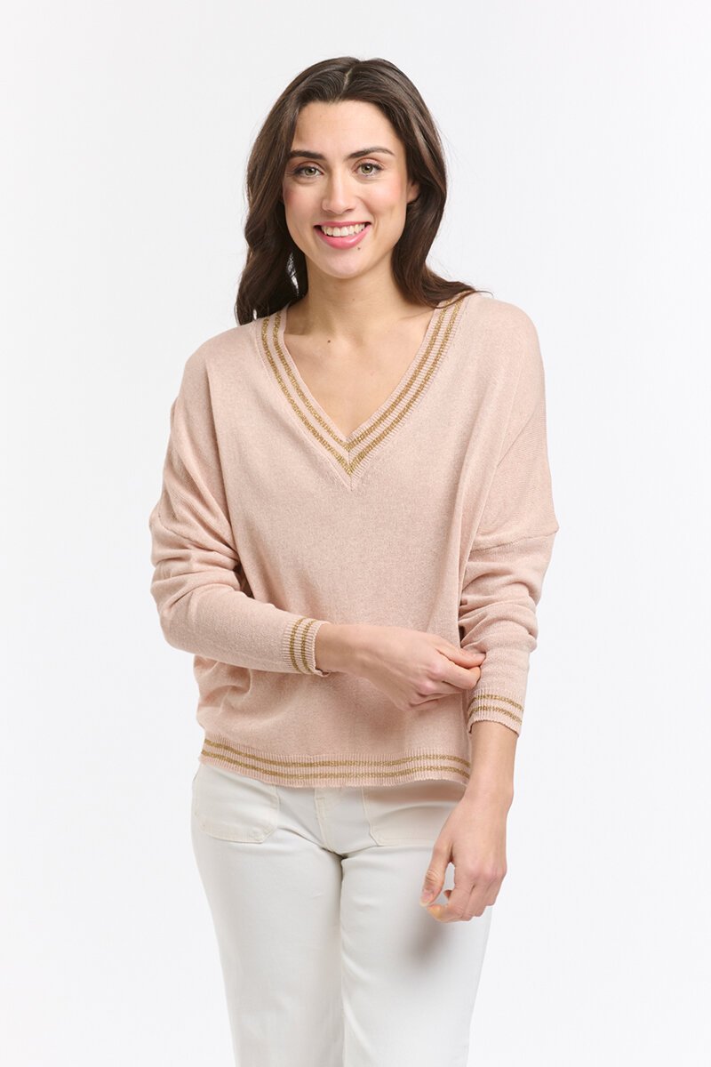 The Lurex College Knit is your go-to for laidback days with a little sparkle. Featuring sporty stripe details with a subtle lurex shimmer, a relaxed fit, and a flattering V-neck, it’s perfect for pairing with denim or layering over skirts.