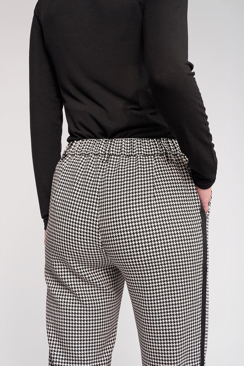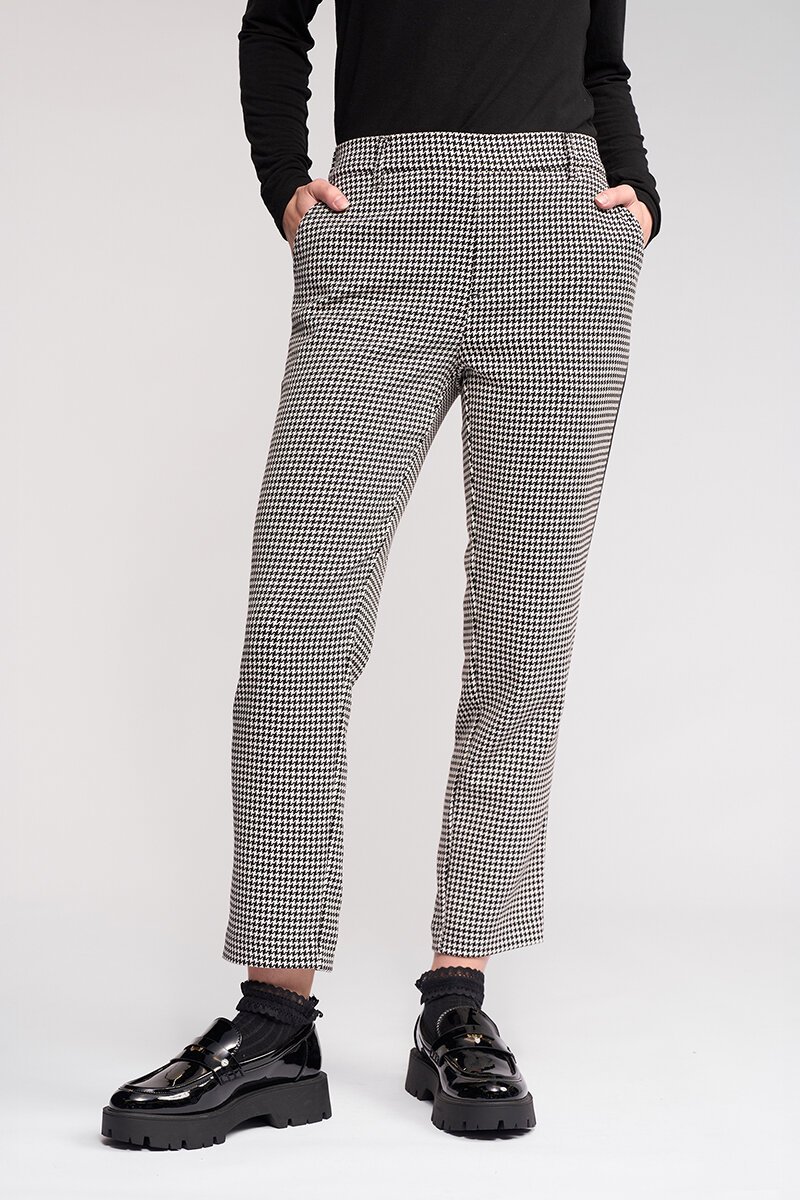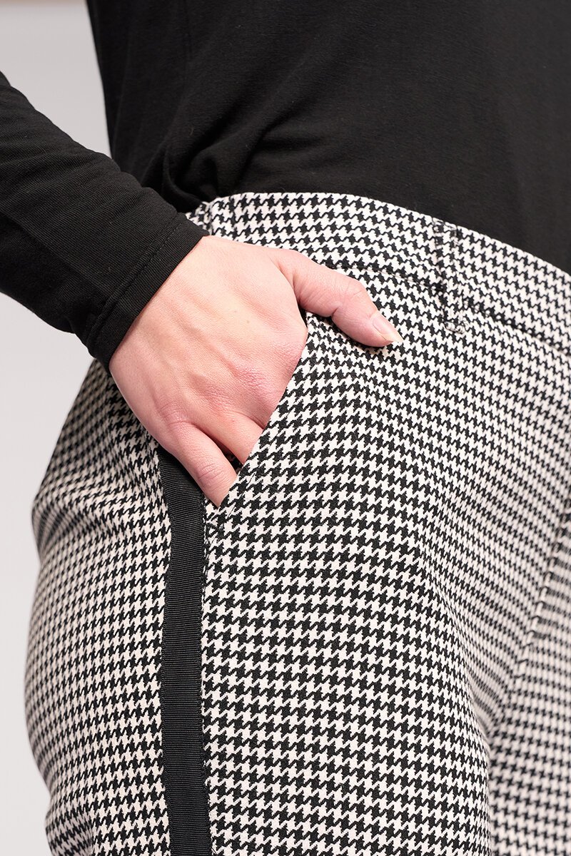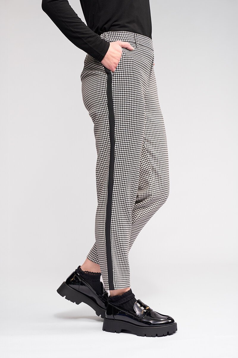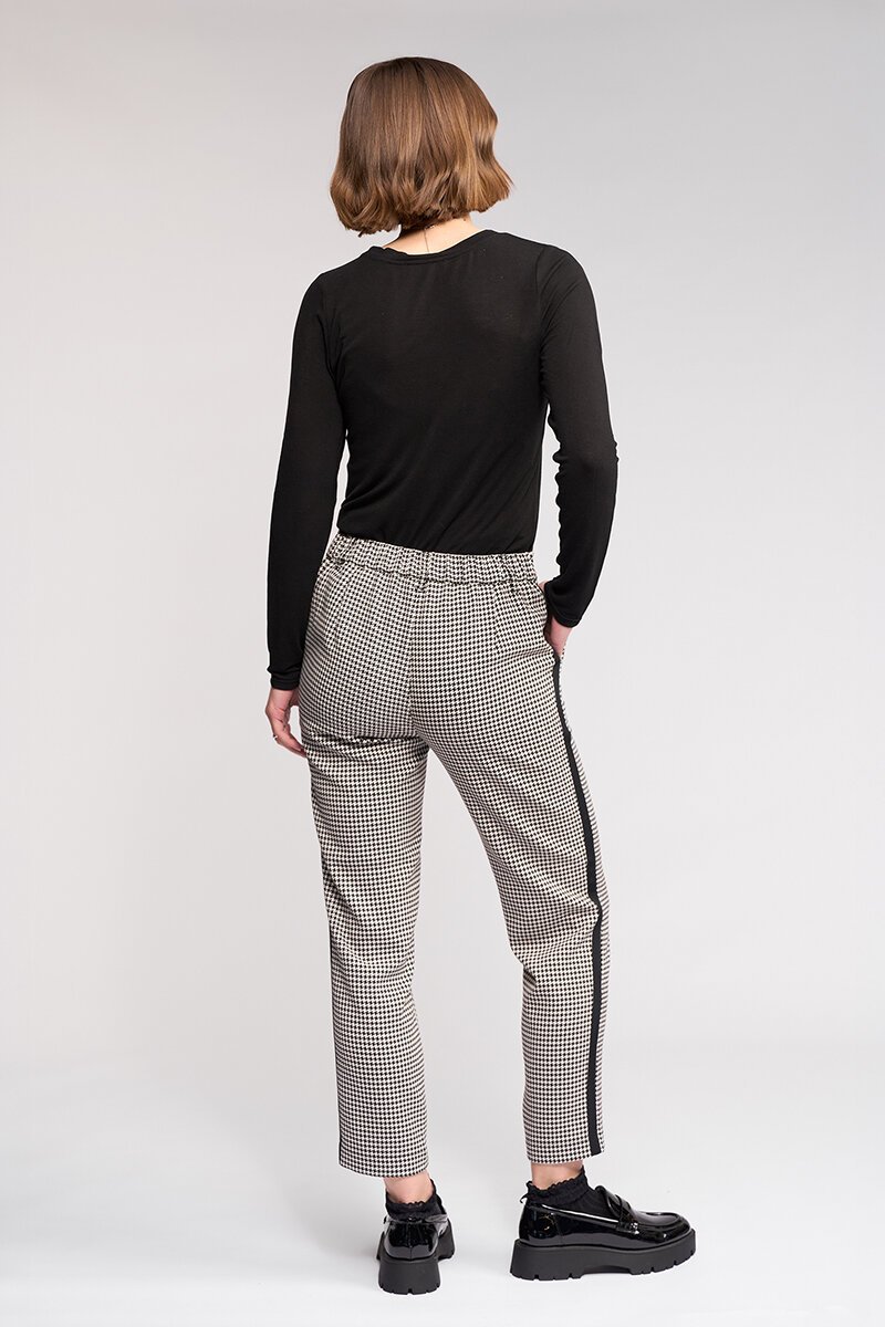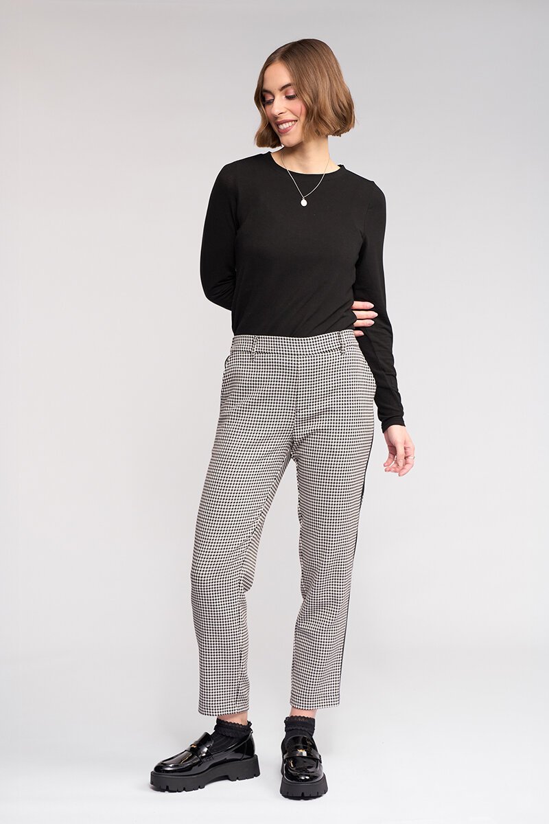 The Knewe Label Como Pant brings a fresh edge to classic tailoring. A clean check base meets a sporty side stripe for contrast, creating a flattering, streamlined shape that works just as well with knits as it does with blazers.