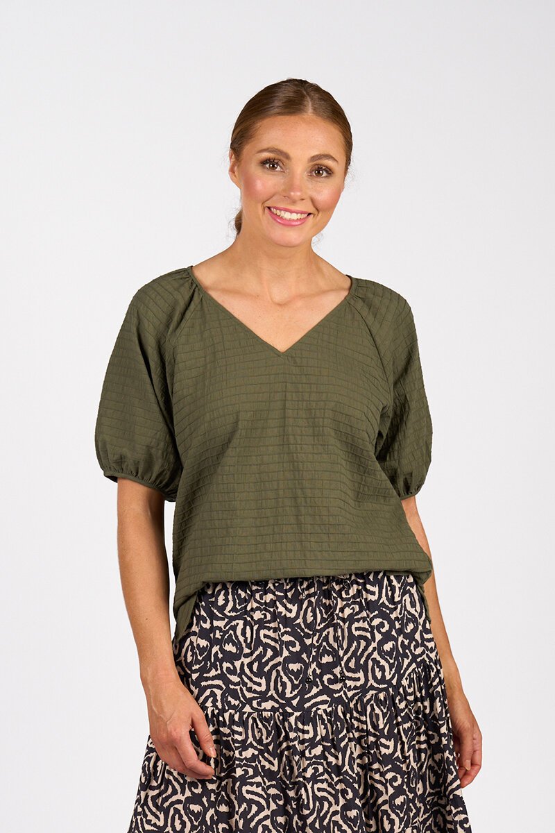 The Knewe Label Focus Top is an effortless everyday style with a flattering V-neckline and puff sleeves for a touch of shape. Crafted in a textured fabric, it’s lightweight, versatile, and perfect for pairing with skirts, pants, or denim.