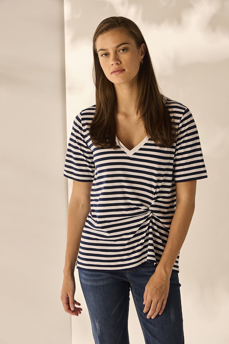 The Lania The Label Mia Top is an easy go-to with a modern twist. Featuring a flattering V-neckline and gathered side detail, it balances casual ease with a touch of shape. Pair it with denim or tailored pants for versatile styling.