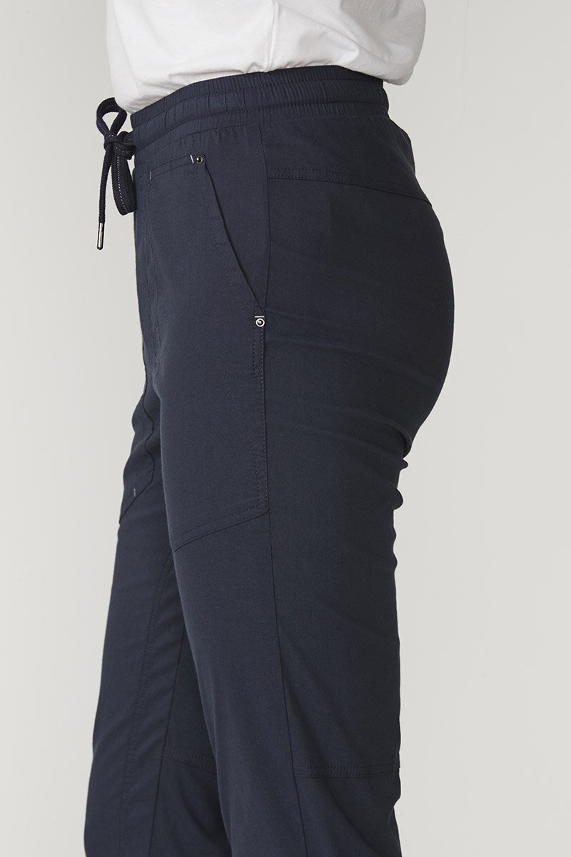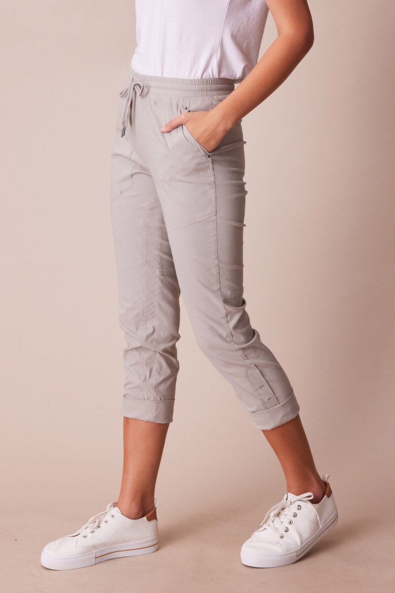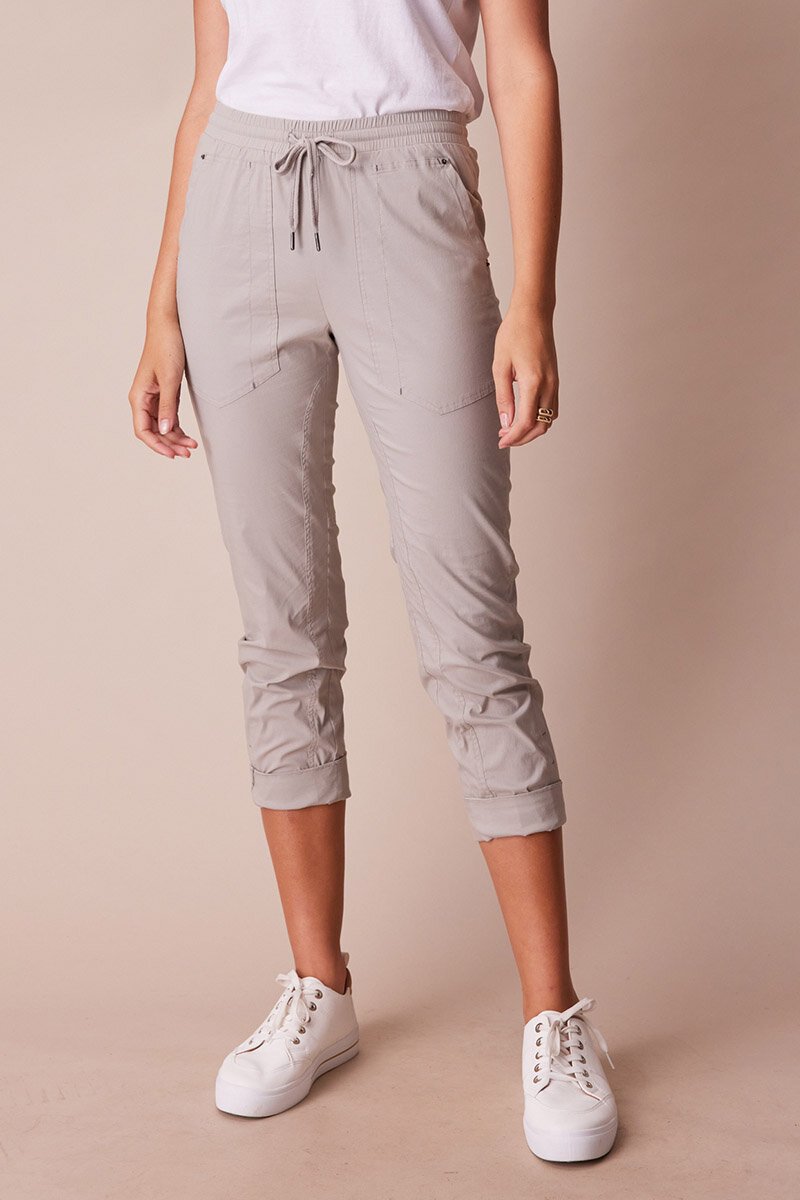 The LTL port 7/8 pant – features elasticated waist with adjustable drawcord, front pockets with antique nickel hardware & relaxed leg with optional turn up cuff. Perfect lightweight cotton rich stretch pant for everyday.