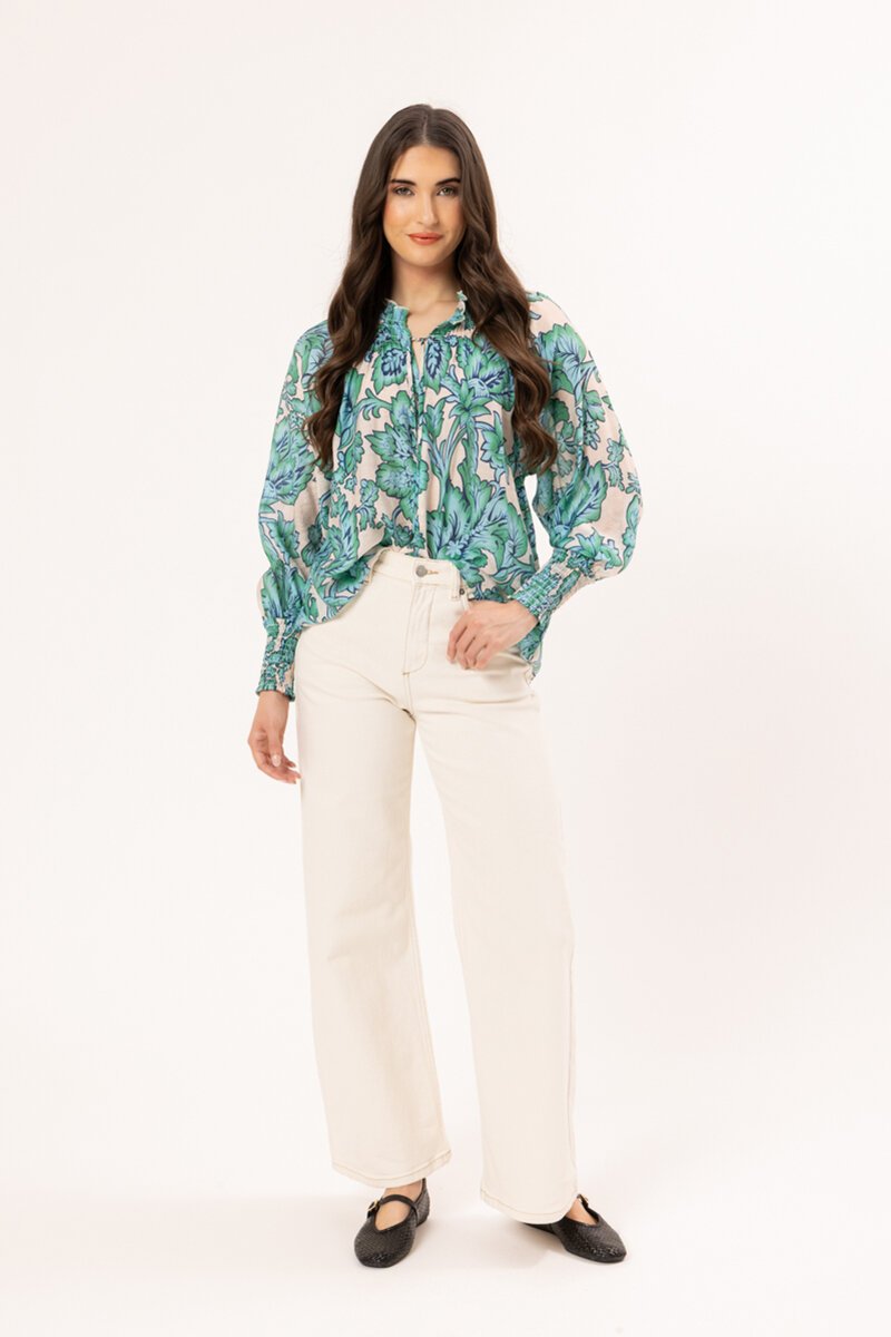 The Leila + Luca Aqua Charm Encourage Top is a floaty printed blouse with soft gathers through the neckline with tie and gentle volume through the sleeves. Lightweight and easy to wear.