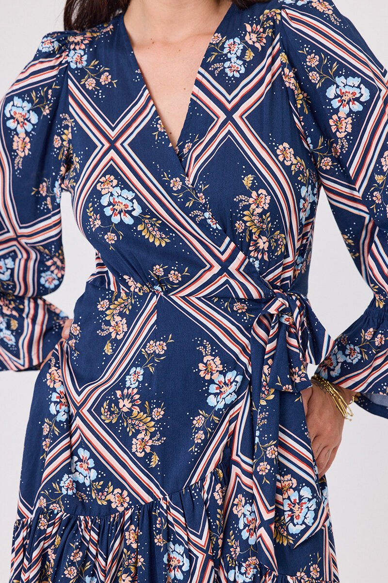The Libertine Wyatt Dress is a dramatic wrap dress with a striking geometric floral print. It features a deep V-neckline, tiered skirt, and tie waist for shape. With long statement sleeves finished in frills, this dress blends elegance with a bold edge.