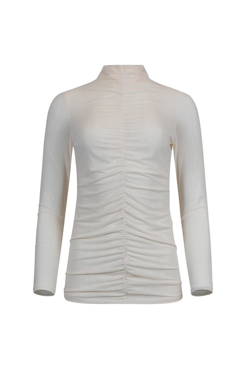The Loobies Story Aston Ruched Top is sleek, sculpted, and seriously chic. Designed in soft mesh with a built-in lining, it hugs beautifully while the ruched centre front creates a flattering shape. The high neckline and sheer sleeves add a modern edge—perfect for layering under blazers or styling solo with statement trousers.