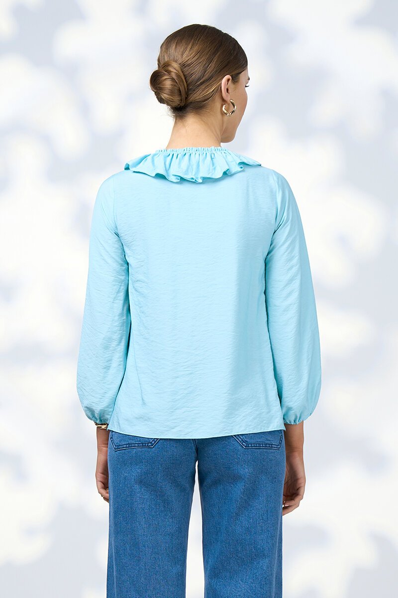 A soft, fluid blouse with a feminine edge. The Evie Blouse features gathered ¾ sleeves and a frilled neckline with a delicate tie detail. A timeless piece that styles beautifully with denim or tucked into tailored pants or skirts.